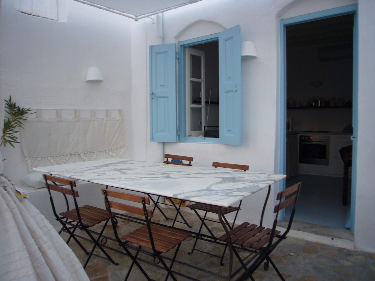 Aloustina's house is a 60sqm house in Chorio.It is fully furnished and fully equipped.The house is on two levels.Wooden stairs lead to the indoor balcony where there are two single beds.Downstairs there is another bedroom with two single beds,a dining room ,the bathroom and a fully equipped kitchen.There is also the tradition moussandra (wooden balcony) with a double bed. Outside the house there is a spacious yard where you can enjoy your meals and relax.
