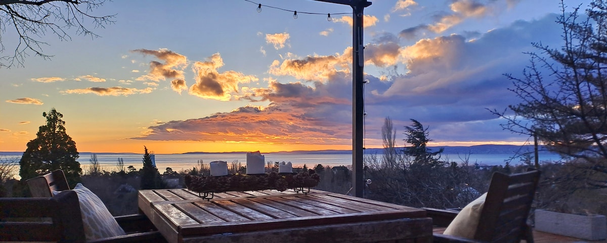 A truly special place just an hour from Budapest. A newly built "old house" with fully opening doors onto the huge patio overlooking Lake Balaton’s biggest bay. See wicked storms approaching over the lake, the always changing clouds and colours of the sky. Welcoming anyone who values this unique experience and the warm design of the house. Get away to the studio if you need to work while still enjoying this special atmosphere. Winter is also very special with breathtaking sunsets and a hottub.