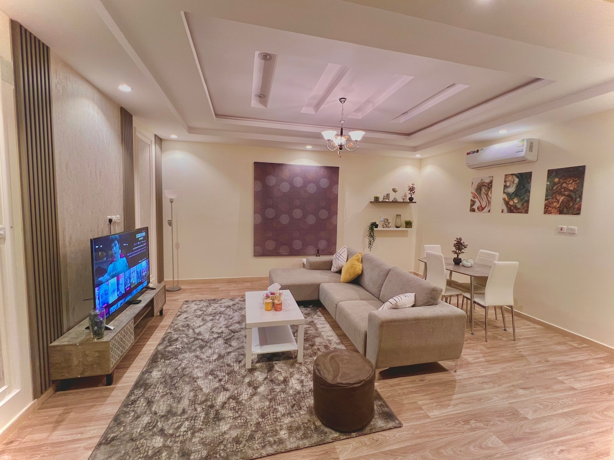Relax in this quiet and elegant home. Enjoy your stay as if you were at home. An apartment with a quiet (Sadu) design with a modern and contemporary character consisting of a hall, two bedrooms, the first (with a king size bed) and the second (with a king size bed), an American-style kitchen, and two bathrooms. It has easy access to the most famous malls, restaurants and entertainment in Tabuk and is 10 minutes away from Prince Sultan Bin Abdulaziz Airport. The apartment can accommodate 4 to 5 people You will definitely find everything you need for a wonderful and complete stay. Note: Not for families of more than 5 people