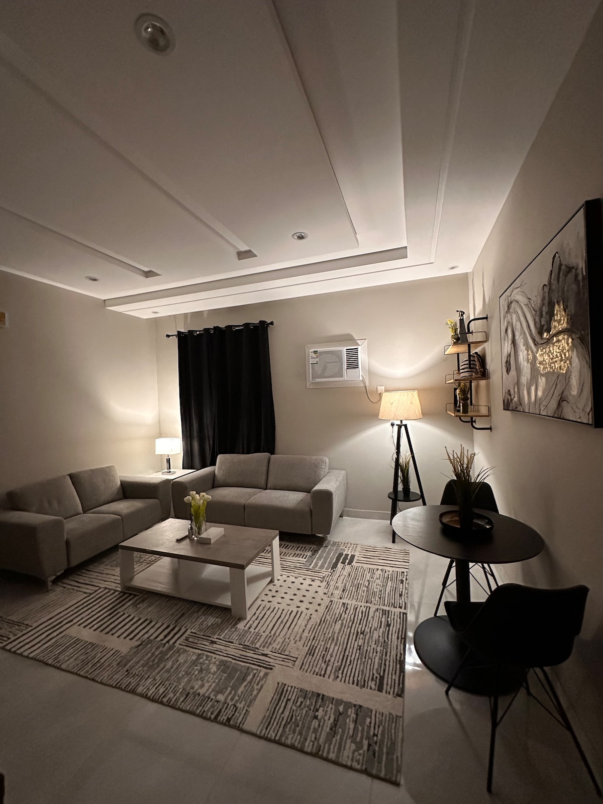 This apartment is designed with a beautiful and distinctive design. It is a quiet and safe apartment with a comfortable design near all services, international restaurants, cafes and malls. It consists of a bedroom with a large bed, a living room and a small terrace ^-^ and a coffee corner, a kettle and a 60-inch screen. A fully equipped kitchen with cooking utensils, oven, refrigerator, microwave, washing machine and hand soap. It is located on the second floor of a residential building (no elevator). It is a very quiet, safe and private area as if you were in your home.