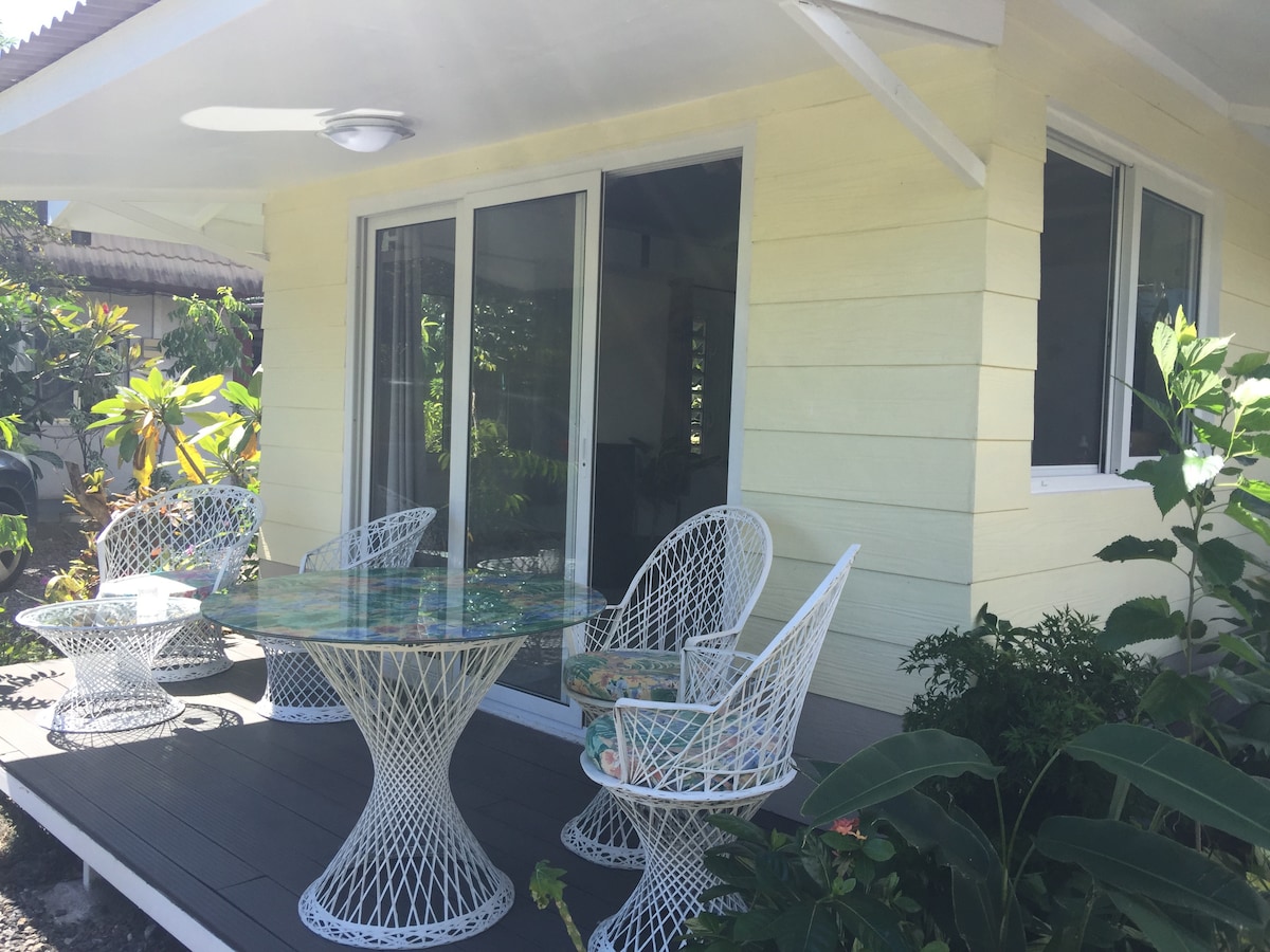 Bungalow duplex indépendant, bord de mer, situé dans une propriété privée. 1 chambre climatisée avec 1 grand lit 2 places + 1 canapé-lit. Un espace cuisine et salle de bain. Terrasse privative exterieure dans jardin bord de l'eau. 2 kayaks à disposition pour accéder au banc de sable à 100 mètres du faré et au spot de surf de Taapuna, à 800 m. Aéroport international /inter-îles à 10 minutes en voiture. Supermarché ouvert 24h/24 à 10 minutes à pieds. Restaurants, snack et roulottes à proximité.