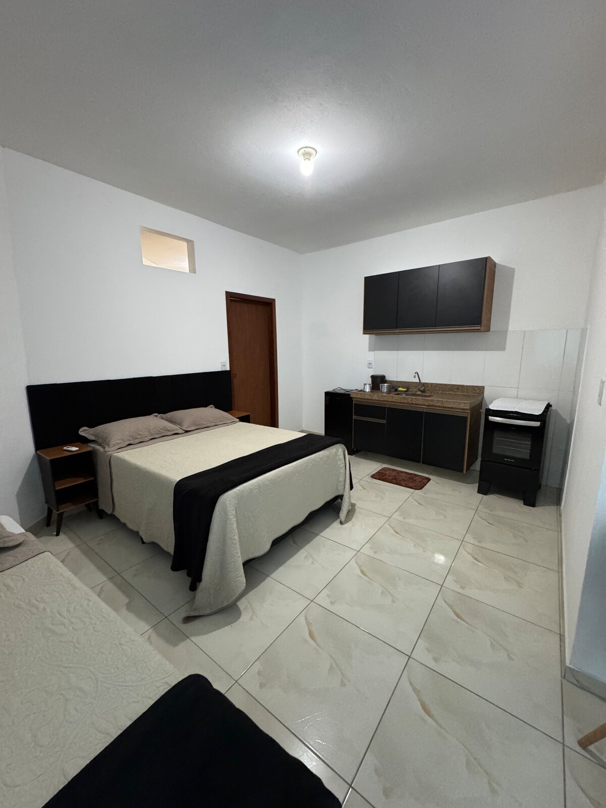 • Furnished apartment with 1/4, air conditioning and double bed; • American kitchen with household utensils: refrigerator, cutlery, glasses, dishes, pots, bowls; • 1 social bathroom; • Shared area: outdoor area with kiosk, barbecue and parking; • Security cameras on the outside; •Wi-fi, smart TV; ✅We provide sheets, pillows and blankets; ❌We do not provide bath towels; ❌We do not change bed linens. 🏡Our space is family-friendly.