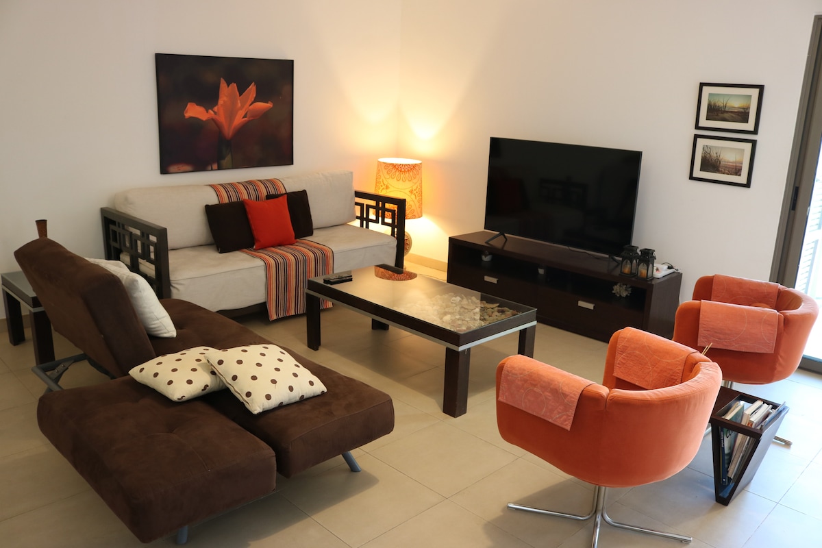 Escape and unwind at this unique and tranquil getaway. Located in Block 18 in Tala Bay right by the beach neighboring the Mövenpick Hotel. Enjoy a relaxing balcony with splendid views of the Mövenpick by day and night. Modern and stylish, this apartment will calm your senses with peace of mind. Sister apartment w/ private rooftop sea view located one floor up for simultaneous booking for bigger groups.