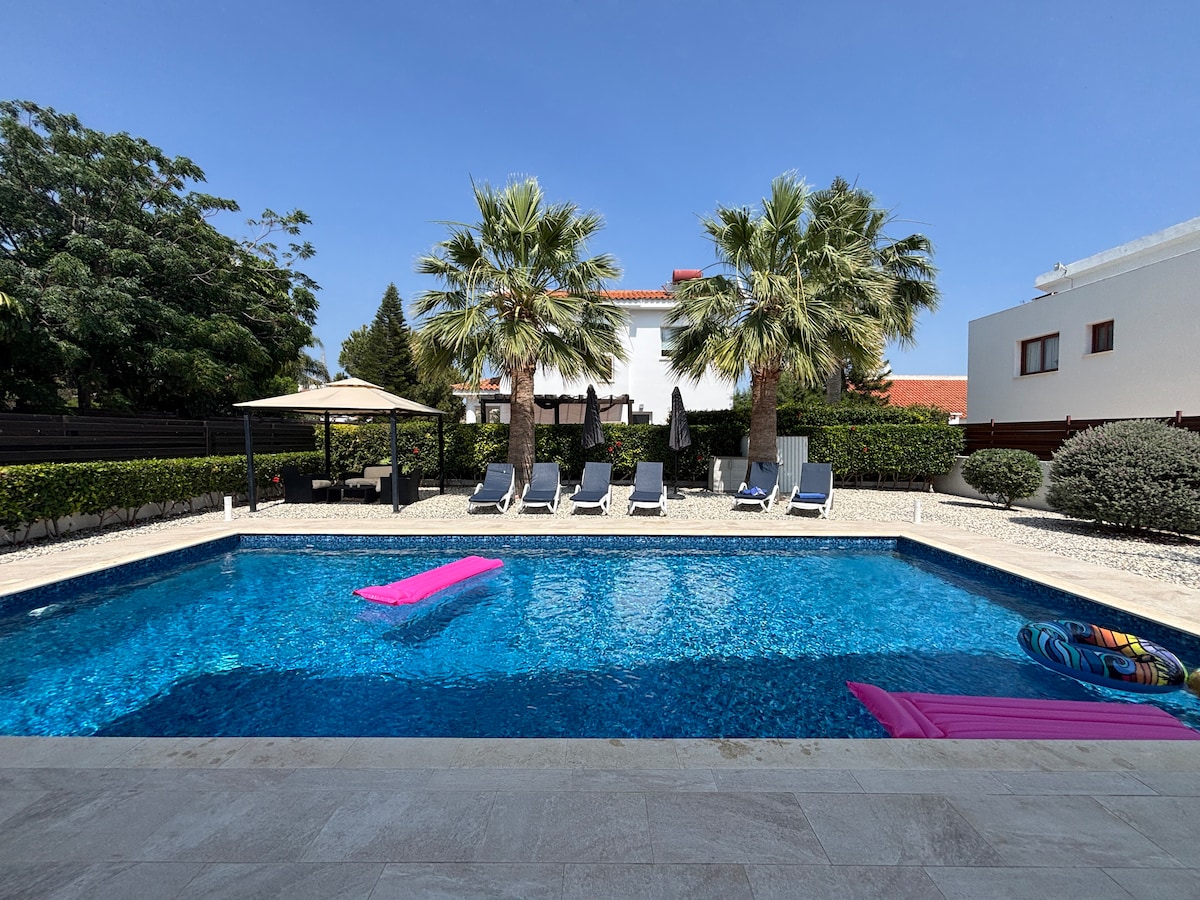 Our luxury 4 bedroom modern villa sleeps up to 8 people and is ideal for those who seeks relaxations and peace The villa is centrally located in Paphos near the hotels directly in front of the Mediterranean sea thus guests can enjoy a relaxing swimming to the beach or to our secluded communal swimming pool. The property has a license from Cyprus Tourism Organization.
