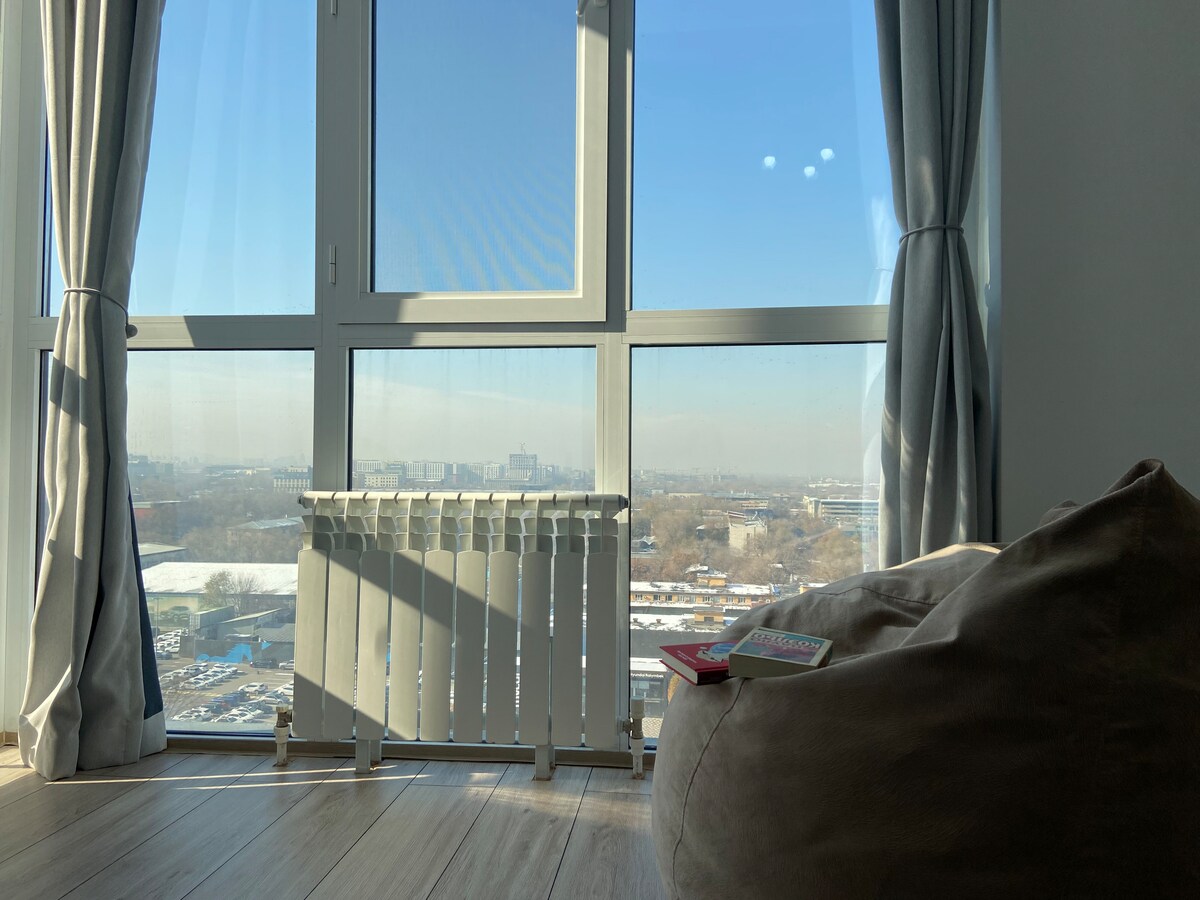 Welcome to your ideal stay in Almaty! Enjoy breathtaking mountain and city views right from your window. -7 minutes to Metro Station -сomfortable bed and cozy sofa -fully equipped kitchen -modern bathroom with fresh towels and toiletries - Wi-Fi and SmartTV The apartment is located in a safe and lively district, close to cafés, supermarkets, pharmacies, shopping malls! Self-check-in available Always ready to assist you — feel free to message any time. Relax, explore, feel at home!