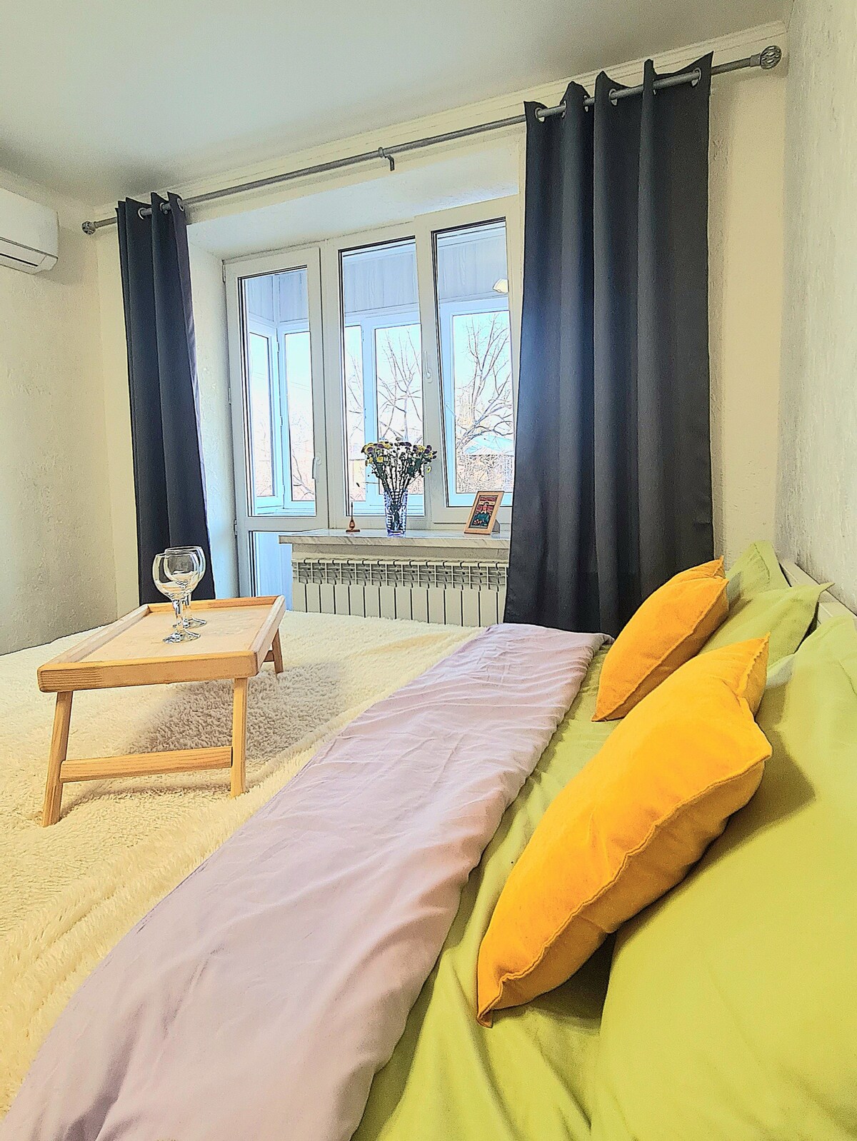 A cozy one-bedroom apartment in an elite residential complex in the center of Almaty. Within a walking distance there are Arbat, parks, MEGA shopping center, Megapark, coffee shops and restaurants. The apartment has a double bed, Wi-Fi, smart TV, air conditioning, shower, hygienic shower, equipped kitchen, microwave, kettle, dishes, iron and ironing board. The interior is in light colors, everything is thought out for your comfort.