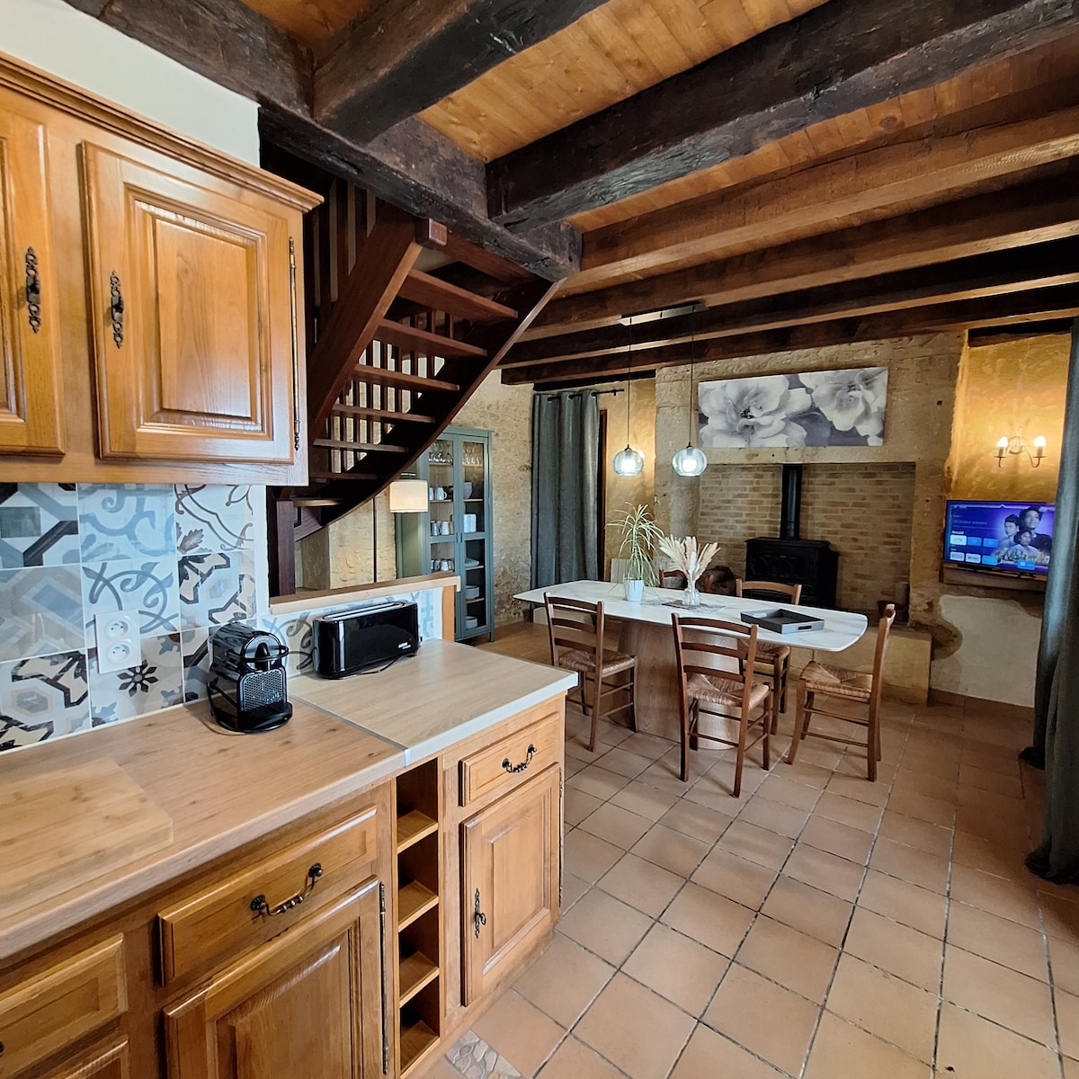 Characterful attic in the heart of a farm dating from 1795, renovated with old materials. It is a unique cocoon typical of Périgord in a peaceful location with countryside views. Hikes, gourmet markets, historical places just minutes away such as Bergerac, Issigeac, Beaumont du Périgord, Monbazillac, Cadouin as well as the Châteaux de Lanquais, Bridoire, Biron…