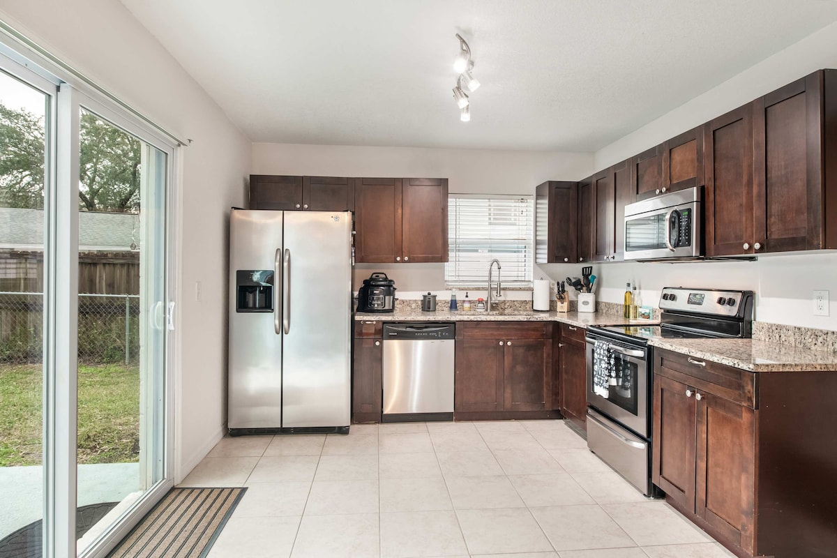 Discover your perfect Tampa family retreat! This beautifully updated 3-bedroom, 2-bathroom home sleeps up to 9 guests and features new flooring, granite countertops, a fully equipped kitchen, fast WiFi, and a spacious fenced yard. Located in a peaceful Tampa neighborhood with easy highway access, you are minutes from the zoo, downtown, Busch Gardens, and all of Tampa Bay's best attractions. Ideal for families, groups, and extended stays.