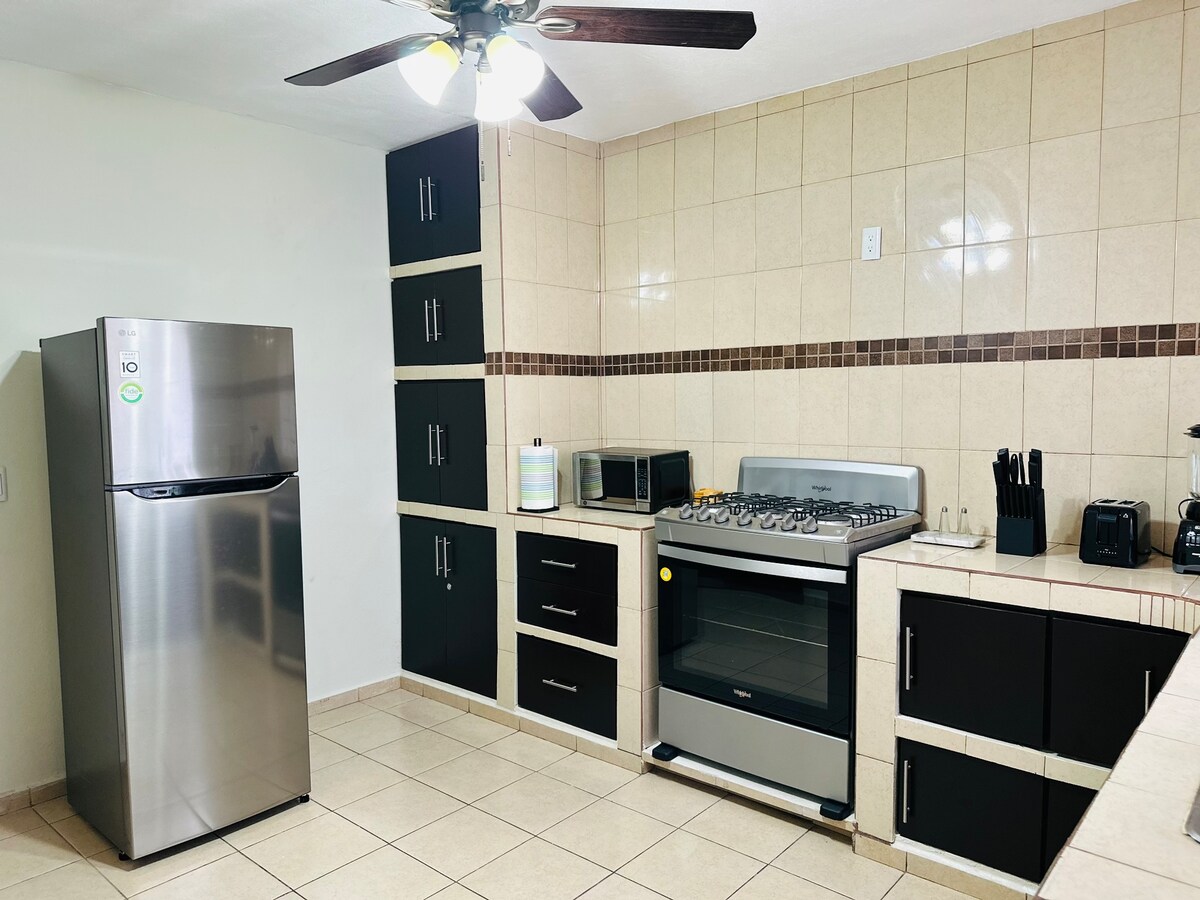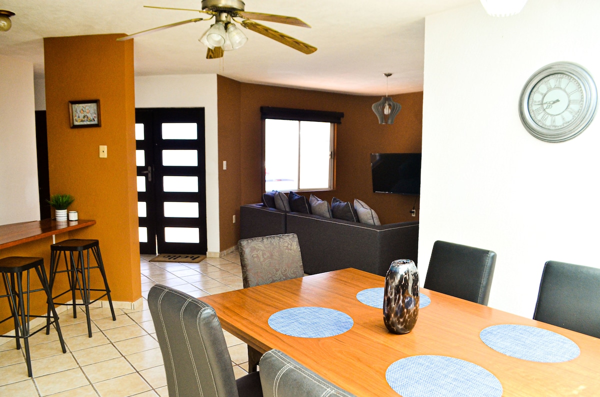 Beautiful and cozy fully independent house for 6 guests. With parking for 2 cars. It has all the amenities, air conditioning in all its areas, Wi-Fi, 2 55" screens, refrigerator, microwave, coffee maker, toaster, blender, stove and hood, washer-dryer. 2 bedrooms with 2 double beds and 1 queen bed. Super well located just 2 blocks from Avenida Hidalgo, a 5-minute walk to Oxxo, Walmart, Cinepolis, Plaza Herradura, Pharmacies and commercial stores.