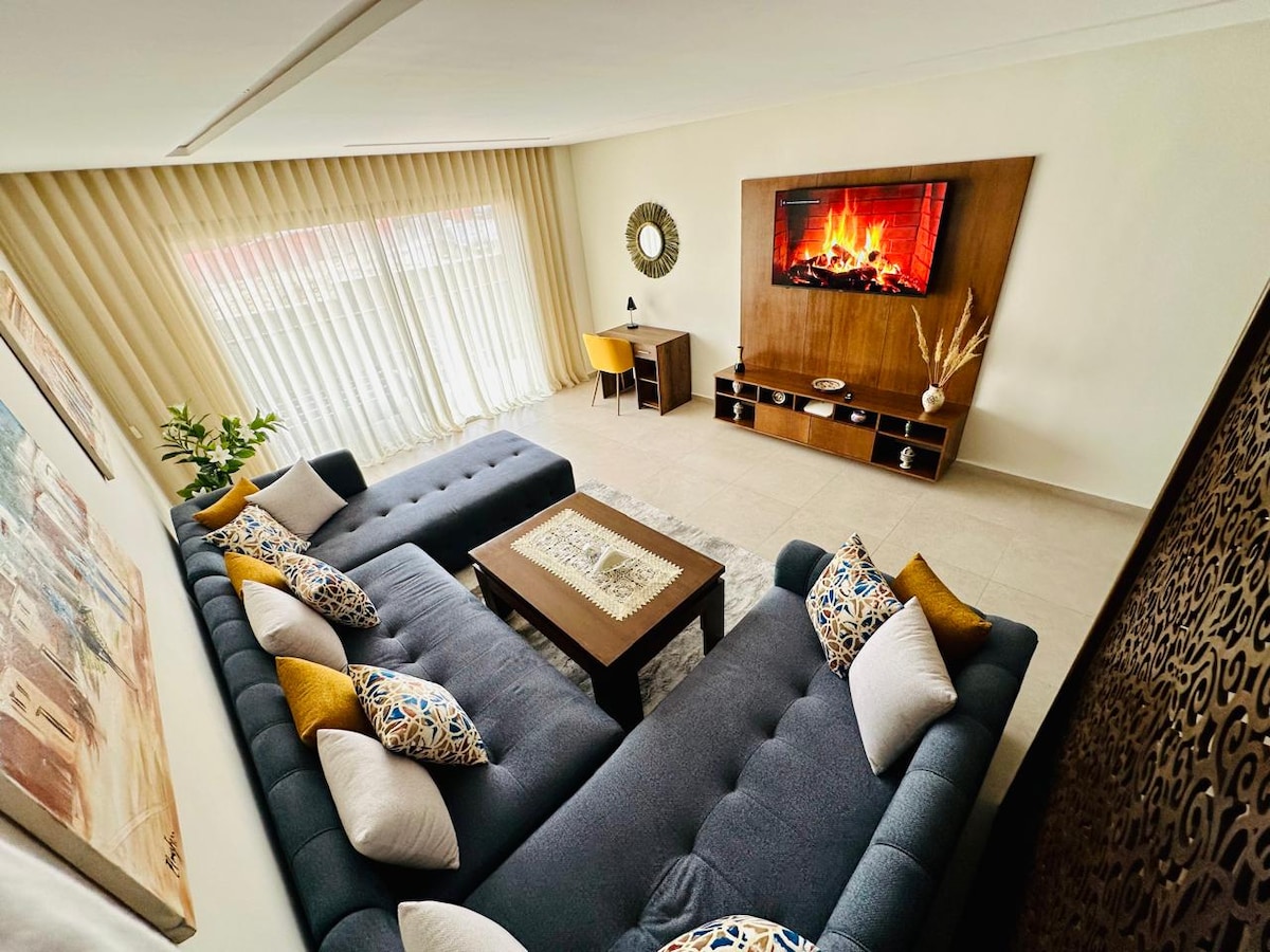 This one-bedroom apartment is perfect for solo travellers, couples, and surfers. The apartment is decorated with a minimalist style and features a spacious bedroom with a queen-size bed and ample storage space. The living room is bright and airy with 2 sofa beds, TV and kitchenette. The apartment is located in the heart of Tamraght, near "Hey Yallah Cafe" Walking distance from Devil's Rock, and a variety of shops, cafes & amenities
