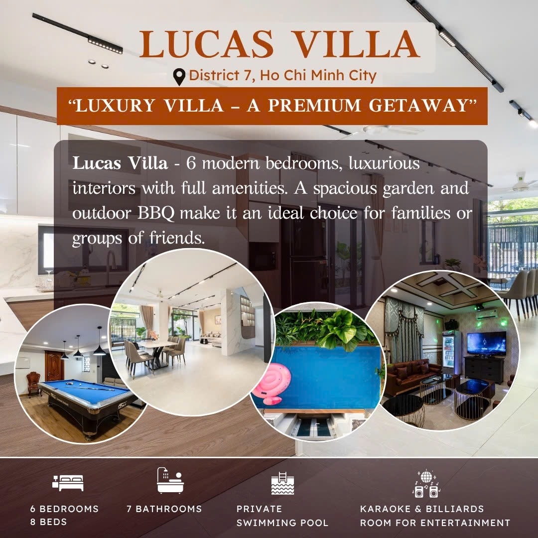 🌴 Villa Sang Trọng 6 Phòng Ngủ Tại Quận 7 – Kỳ Nghỉ Đẳng Cấp 🌴 Tọa lạc tại Quận 7, TP.HCM, villa hiện đại với 6 phòng ngủ, 8 giường, 7 phòng tắm là lựa chọn lý tưởng cho gia đình hoặc nhóm bạn. ✅ Hồ bơi riêng ✅ Sân vườn rộng rãi, BBQ ngoài trời ✅ Phòng karaoke, bàn bi-a giải trí ✅ Nội thất sang trọng, đầy đủ tiện nghi Phù hợp cho nghỉ dưỡng, tiệc tùng hay họp mặt cuối tuần. Không gian riêng tư, thoải mái và đầy phong cách!