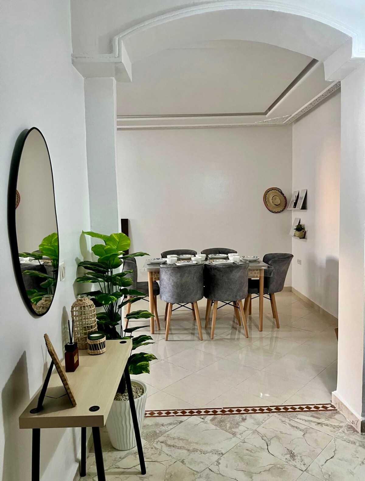 Welcome to our brand new two-bedroom apartment located in a prime area of Tangiers. This upscale property is situated in one of the most sought-after areas in the city with 24-H concierge & is only a 10 min walk from the Train Station, City Centre Mall, Ibn Battuta Mall and beaches. It offers both convenience and luxury at your doorstep. Private parking available. The apartment boasts: fibre optic WiFi, an option for chauffeur and a Moroccan breakfast prepared by our governess (additional cost)