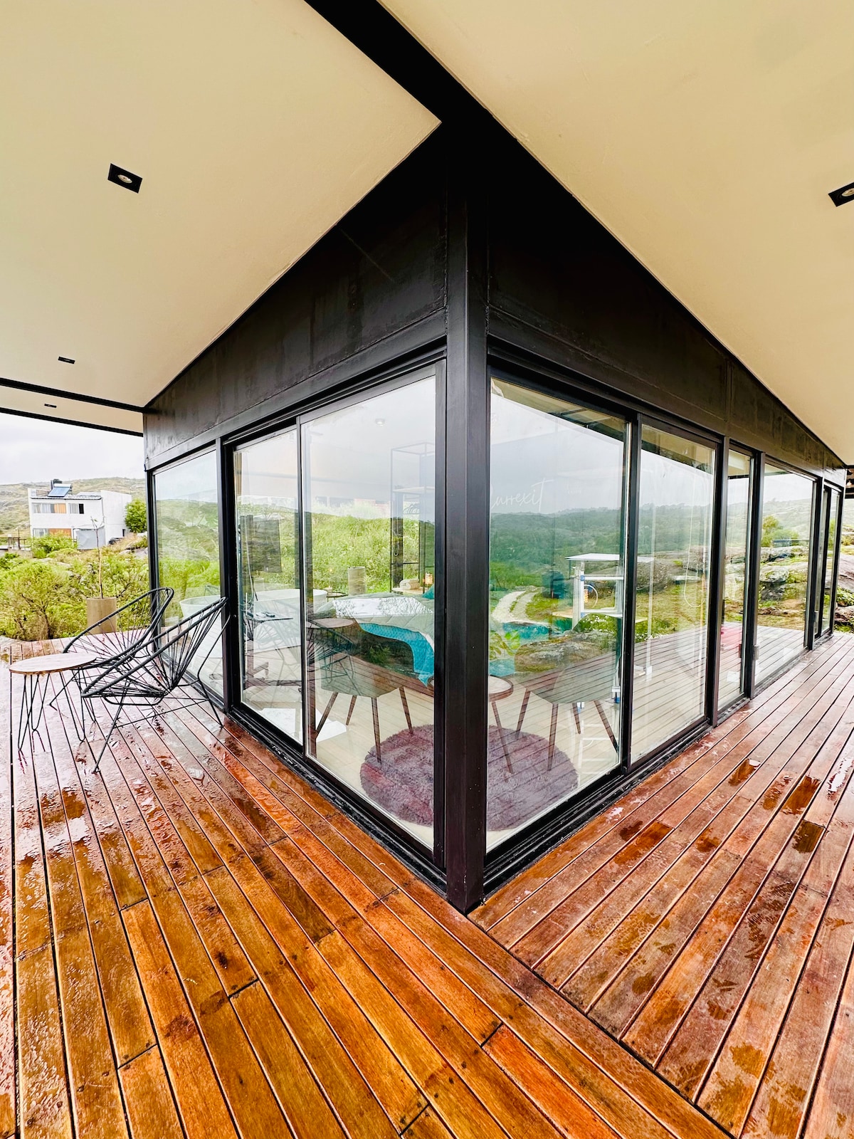 Exclusive cabin for couples in a gated community in Tanti, Córdoba. Fully glazed, surrounded by nature and with 360° views of the mountains. Ideal for rest and reconnecting. It has an outdoor double Jacuzzi on stone, a single tub in the room, a private deck and different coffee makers to enjoy every moment. An intimate and serene place, designed for those looking for a unique experience of peace, connection and deep rest.