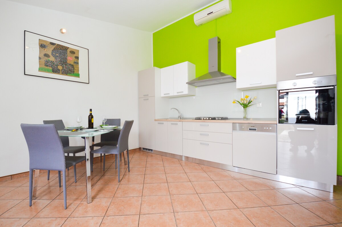 There is a living/dining room with a kitchen, bedroom with one double bed. Bathroom with WC, shower and washing machine. Kitchen, table and chairs for every person, kitchen utensils, pots, cutlery, etc. provided, dish clothes, refrigerator with freezer compartment, oven, dishwasher, coffee machine, microwave, toaster. It has 38 m² fenced terrace. SAT TV. Air condition. Free parking in front of the house. WIFI. PET FRIENDLY.