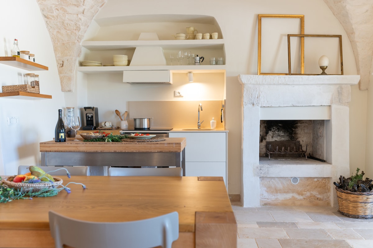 The Trullo Apulia is an exclusive property, made by recovering an original ancient historic domed house (called "Trullo Saraceno"), enriched by swimming pool, Jacuzzi and steam room for private use, in a scenic location, just 2 km from Ostuni and 10 km from the beautiful beaches of Puglia. It can accommodate up to 8 people. Note: the reservation fee does not include consumptions of electricity (0.50€/kWh), gas (5€/m3) and the tourist tax (1€/day for each person for the first 5 days) that will be calculated and paid at the end of your stay. Struttura esclusiva con piscina, idromassaggio, bagno turco, 8 posti letto, posizione panoramica, a 2 km da Ostuni e 10 km dal mare. Nota: i costi di consumi elettrici, gas e tassa di soggiorno non sono inclusi nella fee di affitto e dovranno essere calcolati e pagati alla fine del soggiorno. Italian Version Il Trullo Saraceno Apulia è una struttura esclusiva con piscina ad uso privato, in posizione collinare panoramica, a soli 2 km da Ostuni e 10 km dalle splendide spiagge pugliesi. Dispone di 2/3 Camere da letto matrimoniali, 4 bagni (di cui uno con bagno turco, vasca idromassaggio e doccia emozionale), 2 zone living (con 2 divani letto matrimoniali), 2 cucine, 2 camini e può comodamente ospitare fino a 8 posti letto. Atmosfera unica che unisce l’inconfondibile stile mediterraneo ai comfort più moderni, per un soggiorno esclusivo ed originale, all’insegna di relax, privacy e benessere naturale. La struttura è costituita da 2 unità abitative (trullo saraceno con 3 coni + lamia) totalmente indipendenti, ma comunicanti tra loro, separate da una porta con serratura. Ciascuna unità comprende una sala da pranzo con camino, TV a led satellitare e divano-letto matrimoniale, un cucinino completo di elettrodomestici (frigo-freezer, forno elettrico, lavastoviglie, lavatrice, piccoli elettrodomestici)e una camera da letto con bagno privato, completo di doccia emozionale per cromoterapia. Ideale per 2 famiglie di amici che, fatta salva la privacy, possono godere di momenti comuni di relax e divertimento, può anche essere utilizzata come unica unità abitativa, utilizzando una delle due zone living come terza camera da letto matrimoniale. Tutti gli ambienti della casa sono climatizzati e dispongono di connessione internet WiFi. Gli ospiti hanno a disposizione un parcheggio privato. L’intera struttura ha una capacità ricettiva massima di 8 posti letto, mettendo a disposizione dei suoi ospiti ben 4 bagni, di cui 2 interni completi, un’area benessere con bagno turco, aromaterapia, ampia vasca idromassaggio (che si affaccia su una suggestiva parete rocciosa), doccia emozionale con cromoterapia e servizi igienici ed 1 bagno esterno (water+lavandino) con doccia. L’esclusiva piscina a sfioro di acqua salata con idromassaggio è immersa nel verde della macchia mediterranea. Questa oasi di privacy e di relax dispone di tutto il necessario, inclusa una Zona solarium, la doccia esterna ed il bagno di pertinenza. La profondità dell’acqua della piscina risponde ai requisiti di legge per garantire la massima sicurezza anche dei più piccoli. Molteplici sono gli spazi esterni arredati e le ambientazioni minimal chic che consentono agli ospiti di pranzare o cenare su un ampia terrazza panoramica ombreggiata da un gazebo cannucciato o di gustare, appena svegli, una ricca prima colazione all’aperto, in un’area attrezzata proprio davanti alla portafinestra della propria camera da letto, respirando i profumi dei campi, nell’intimità della luce del primo mattino. Al tramonto, l’unicità del trullo e del giardino circostante, vengono ancor più esaltati dall’illuminazione serale, che vi regalerà nuove emozioni ed un fascino indimenticabile, rallegrati dai sapori inconfondibili dei cibi grigliati al barbecue. Il complesso abitativo è frutto di una recentissima ristrutturazione di costruzioni dal valore storico (il Trullo Saraceno dalla caratteristica cupola bianca è ancora più antico del trullo a cono), in cui il sapiente recupero dei materiali, delle tecniche e dei canoni tipici dell’architettura e della storia pugliese, hanno consentito un restauro di interni ed esterni che mantenesse una linea fortemente evocativa e rispettosa dei luoghi, anche nell’arredamento dai colori chiari e naturali, studiati con la massima attenzione ai dettagli e costituito da pezzi unici e originali. Il fascino della location non conosce paragoni: la costruzione si affaccia su un giardino terrazzato caratterizzato dai tipici muretti a secco, oltre i quali si apre, a perdita d’occhio, su un’area di circa 6.000 mq di pertinenza esclusiva della casa, una valle di magnifici ulivi secolari su terra rossa. Un agrumeto, un frutteto, ampie aree di macchia mediterranea tra le quali trovano spazio molte piante ed erbe aromatiche, dischiudono immagini, in un tripudio di colori e profumi di natura incontaminata che illuminano gli occhi ed allietano la mente. l frutti e gli ortaggi tipici pugliesi, totalmente biologici, sono a disposizione degli ospiti. NOTA: Trullo Apulia promuove un uso sostenibile dell'energia elettrica e dell'acqua (presenti pannelli fotovoltaici e per riscaldare l'acqua sanitaria) e ci piacerebbe che anche i nostri ospiti facessero lo stesso. Per questo motivo non includiamo i consumi elettrici in maniera forfettaria nelle spese di affitto ma saranno conteggiati secondo il consumo effettivo che verificheremo insieme, confidando in un vostro uso responsabile (per il dettaglio, vedi la sezione "Altre cose da considerare"). English Version The Trullo Saraceno Apulia is an exclusive property with swimming pool for private use, in a scenic hillside location, just 2 km from Ostuni and 10 km from the beautiful beaches of Puglia. It has 2/3 Double bedrooms, 4 bathrooms (one with a steam room, whirlpool bath and emotional shower), 2 living areas (with 2 sofas bed for 4 people), 2 kitchens, 2 fireplaces. The whole structure can comfortably accommodate up to 8