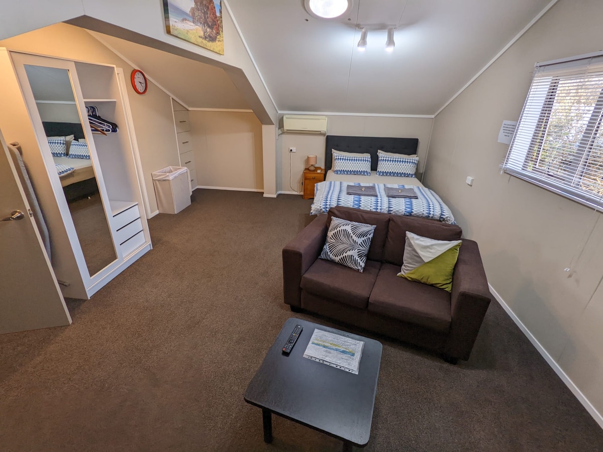 5 minutes’ drive from central Palmerston North. Spacious (60m2) in a nice neighborhood. Has ensuite with shower, vanity, toilet BUT NO FULL kitchen. Has wardrobe, microwave, hair dryer, Smart TV/NETFLIX, toaster, plates, cutlery, chopping board, small oven, electric kettle, fridge, heat pump, tea, coffee & milk. NB; Breakfast ISN'T included. Free parking on premises/street. Laundromat & dairy/convenience shop are nearby. Several restaurants/supermarkets and River-walk in 15-20 minutes’ walk.