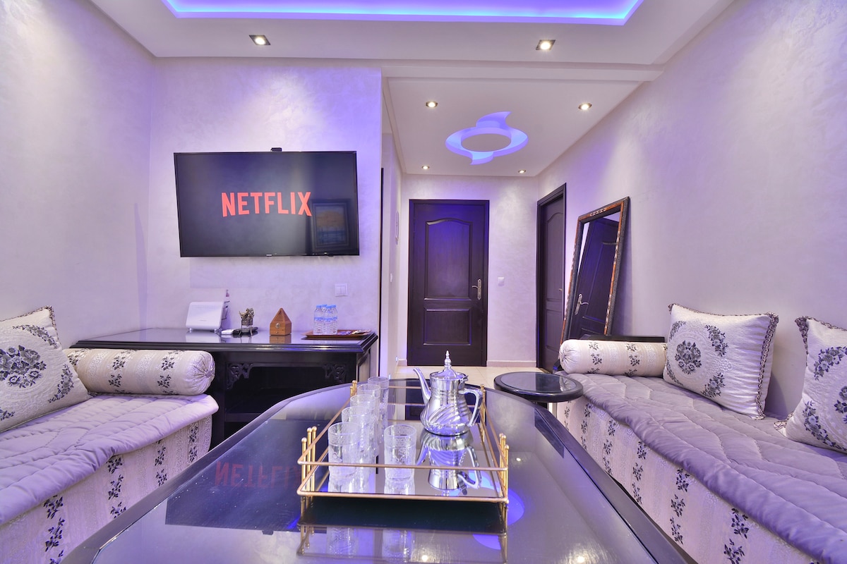Welcome to this beautiful apartment in Marrakech, A bright living room with a touch of modern Moroccan décor A fully equipped kitchen Nespresso machine High-speed fiber optic Wi-Fi.60” Smart TV Netflix 3 air conditioners for year-round Key box for self check-in Just 2 minutes from McDonald's Drive and 10 minutes from Jemaa el-Fna Surrounded by shops, restaurants gym and supermarket Easy access to public transportation and main roads
