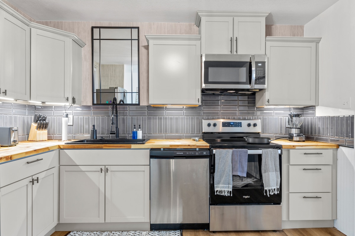 This new backyard guest house is on a tree-lined street. Full kitchen with gas range is perfect for weekend dinners or to stay longer. The decorative welcome sign folds up to a table for two. The living room is a perfect place to unwind with WiFi and AppleTV or an assortment of books. It is pet friendly and can accommodate kids on floor pallets, if needed. This house is in our family's backyard, but we make sure you have a private stay.