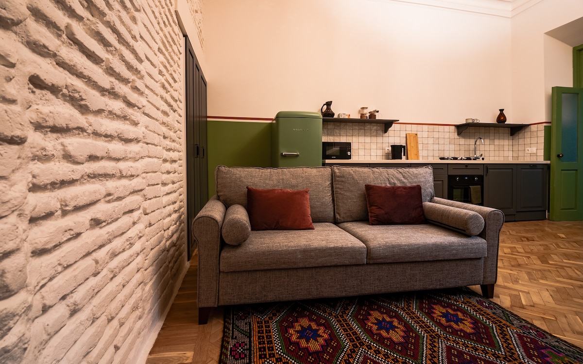 This is a comfortable renovated apartment with exposed brick that has a true Tbilisi feeling. This studio has a transparent bathroom with modern bathtub, king size bed, Chesterfield sofa and etc. The Space (78 sq.m) fits 2 & is located on Old Tbilisi district, on parallel street of main avenue of Georgia Shota Rustaveli Ave. High speed WIFI Internet & IPTV is provided free of charge. Apartment is also well located for transport Metro Freedom Square & Rustaveli stations are walk distance.