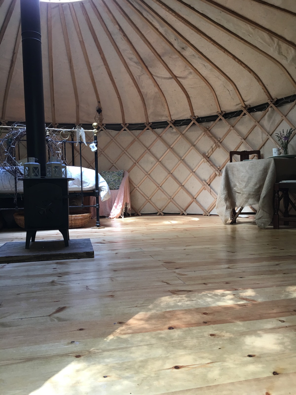The Barn at Lees Farm is nestled in the Ironbridge Gorge World Heritage site, this locally made felt lined Yurt gives you a generous space with a double cast iron bed. Heated by wood burner, making it lovely and cosy. The Yurt is Off Grid so you can truly enjoy relaxing, indoors & outdoors, whilst enjoying home comforts. Cook outdoors using the firepit/pizza oven or indoors on the wood burner or camping stove. Dog friendly. Wood Fired Hot Tub (EXTRA). Firepit. Fairy Lights, Blankets and Nature.