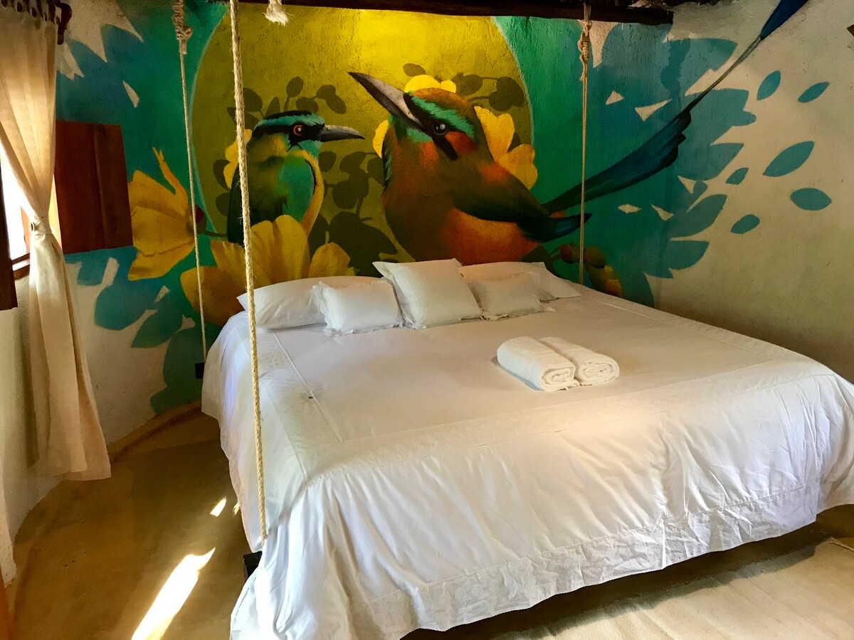 Cabins in the middle of the Mayan Jungle, part of the Mayan Village Xeneba, designed and built by Mayans, ideal for contact with Nature and Mayan Culture, with a hanging bed and on its walls a Mural of one of the emblematic birds of the region painted by a Mayan Youth, 20 meters from a Mu'ul (ancient Mayan hill) ideal for meditation, 100 meters from the Ceverna-Cenote Zazil Tunich, to enjoy a Romantic Dinner 20 meters underground, and near the Archaeological Zone of Ekbalam is