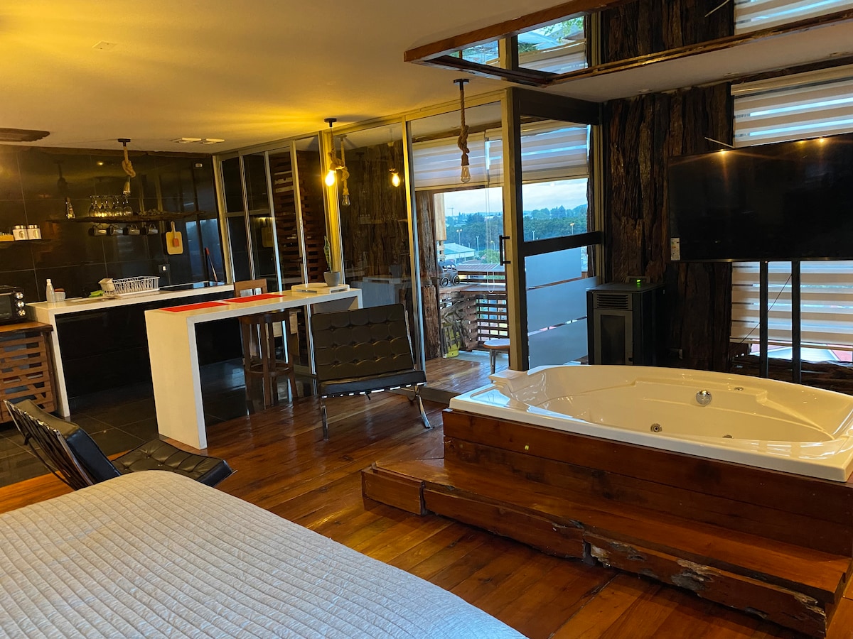 Relax on this unique getaway. Rustic apartment with pellet heating, includes a comfortable and relaxing Jacuzzi to make your stay a unique moment. Decorated with native Pellines and Araucanía symbology. It is located on the 5th floor (no elevator). Parking is included. Close to downtown, ideal for couples.