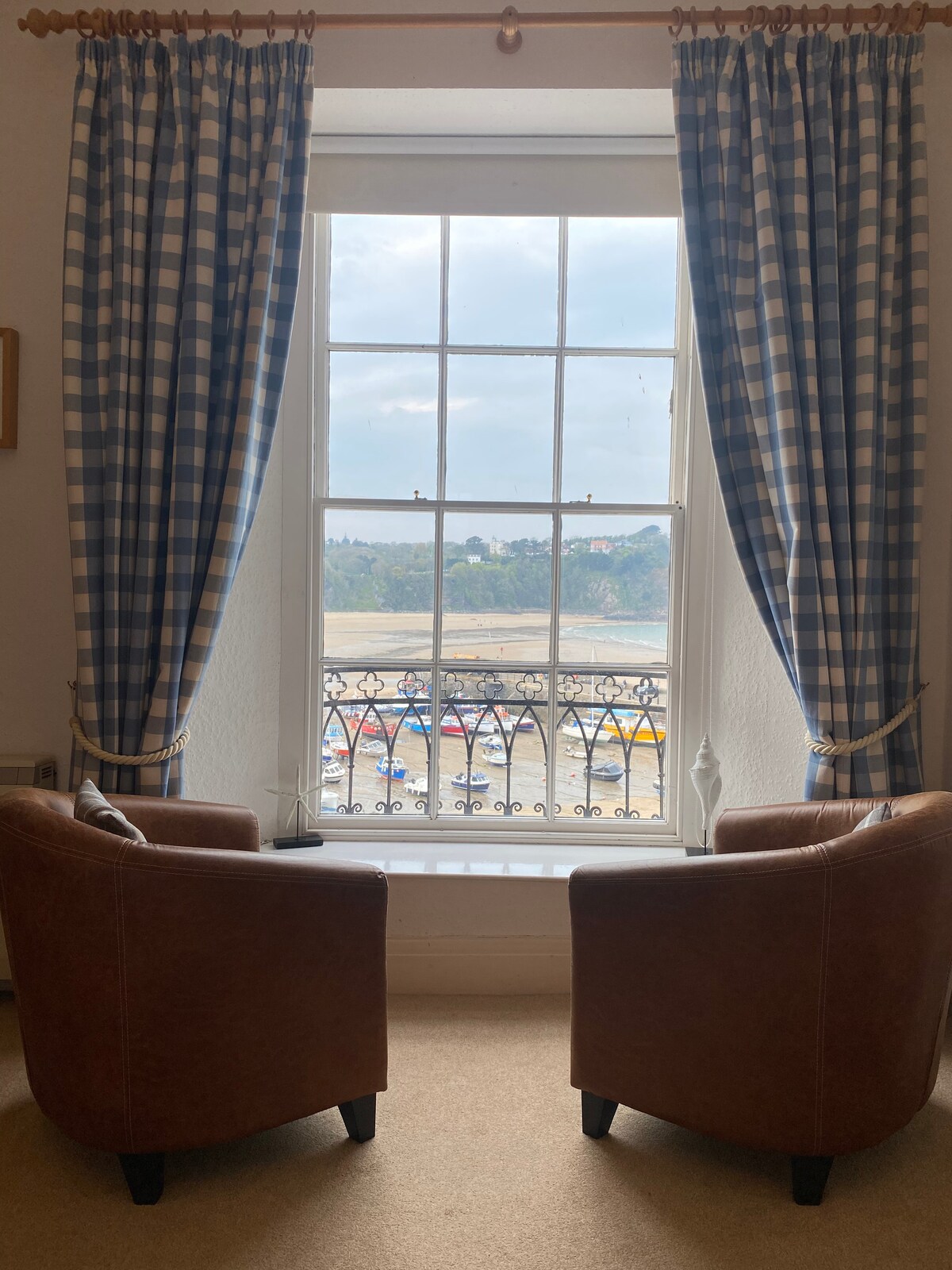 Cheriton View is a first floor apartment in a converted Victorian House, located in a residential street just outside the historic town walls. The decor has a seaside theme and feels bright and airy. From the lounge and kitchen window you have distant views of the sea and Caldey Island. Sit in the window & watch the world go by. SMART TV with high speed internet 🛜 Stairs from the front door take you to two landings giving a greater feel of spaciousness and relaxation