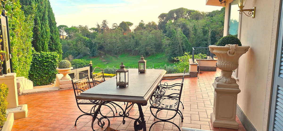 Luminoso e confortevole appartamento in Villa a soli 30 minuti da Roma, in zona residenziale collinare, con vista sulla campagna circostante.L'appartamento è al piano terra di una Villa con ingresso indipendente, parcheggio interno e ampio giardino;può ospitare fino a quattro persone, ha una camera da letto,un bagno,angolo cottura fornito di utensili, frigorifero, forno,microonde e zona living con wifi, tv, due poltrone reclinabili, un grande tavolo da pranzo e un divano letto matrimoniale.