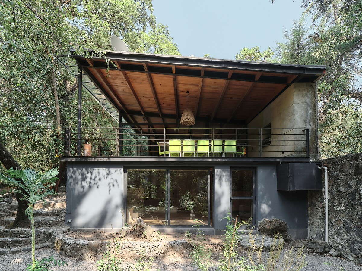 Enjoy the middle of nature in the woods. In the morning you can hear the birds singing with a coffee, take the time to connect with your tribe and enjoy the day as few times you can. The cabin is located 15 minutes from downtown Tepoztlán by car or 5 minutes on foot to the transport that will take you downtown. You can also avoid all the traffic as you don't need to cross downtown. Very convenient on long weekends and holidays. The property is fenced. Vegetation varies.