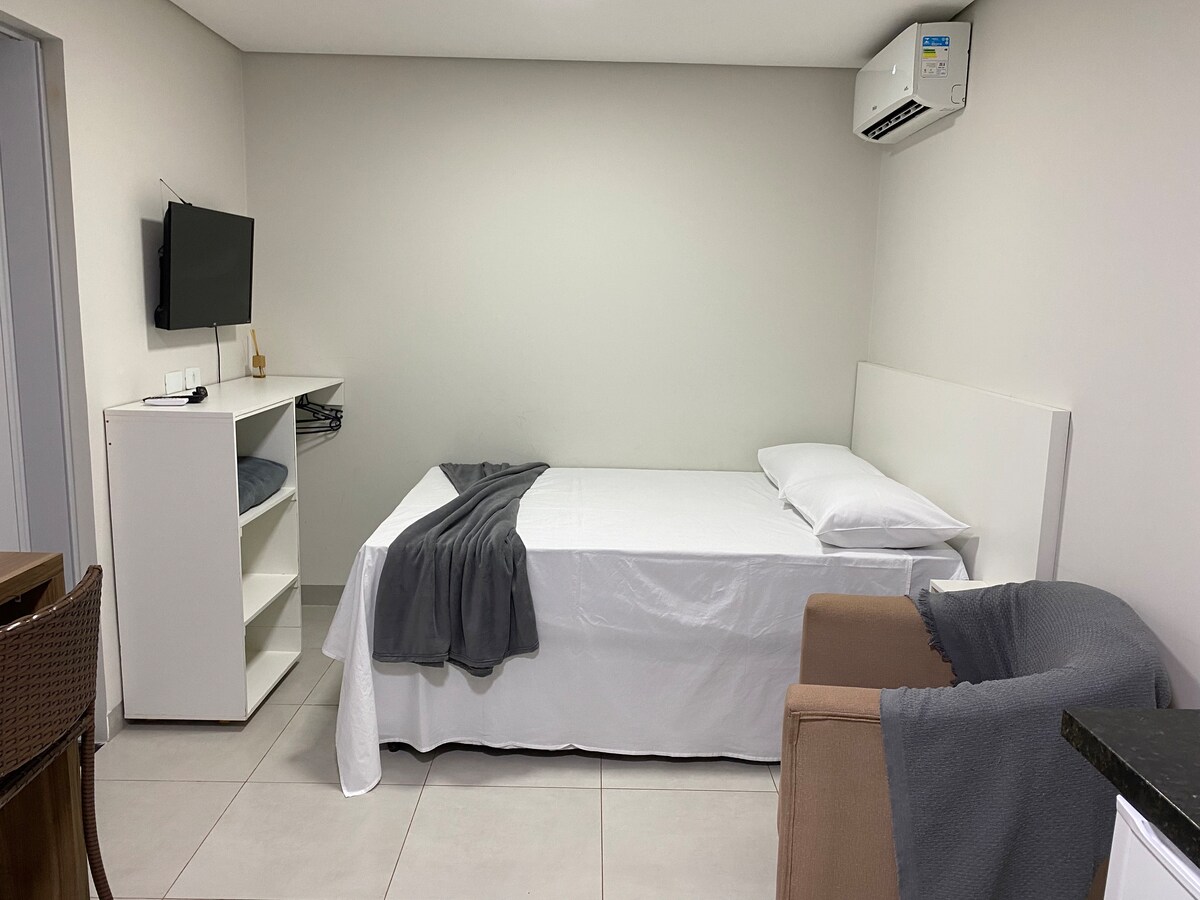 Keep it simple at this peaceful and centrally-located place. It features: 1 bathroom. 1 double bed. 1 armchair. 1 smart TV. Stove, minibar and essential kitchen utensils. CAUTION: *The space has an integrated bedroom and kitchen. *The laundry room is shared. *We do not provide bath towels. *The parking space is small. *No pets allowed. Super quiet condominium in a residential neighborhood. Close to Orla Morena and the city's best supermarket chain.