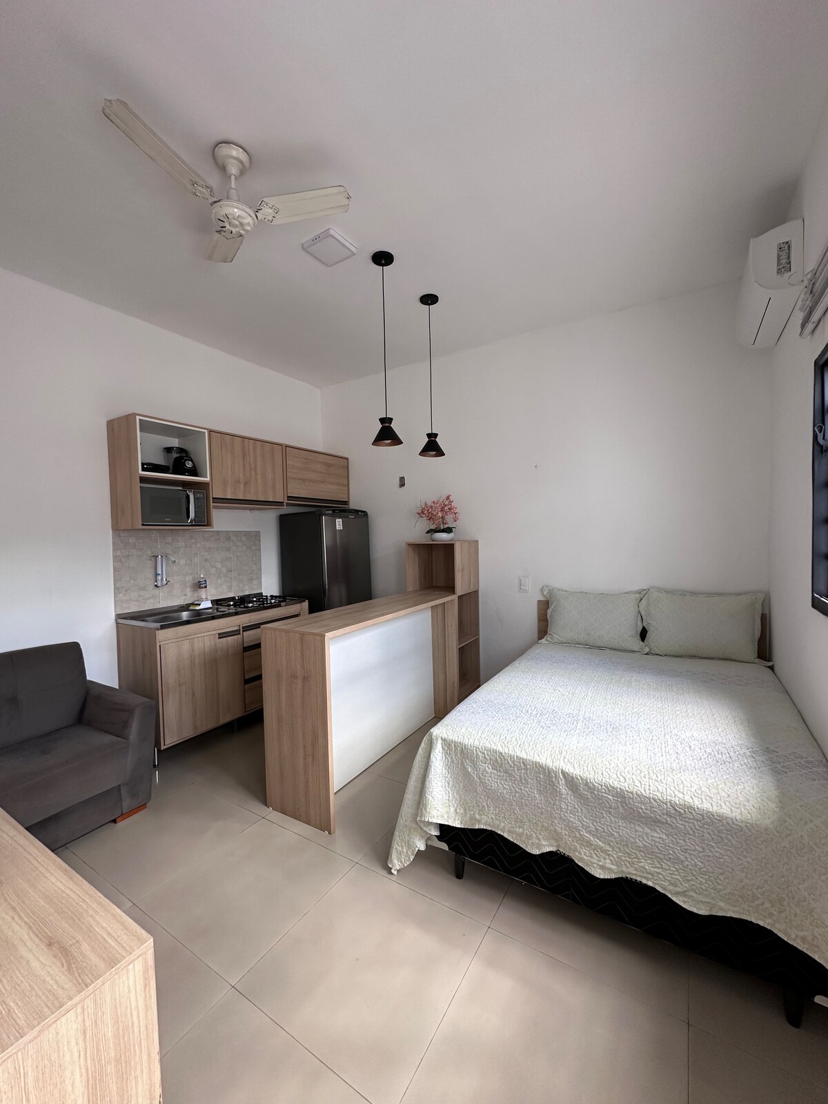Acomoda-se com conforto até 2 pessoas em FLAT STUDIO - 1 quarto com cama Queen. Há ainda um sofá-cama individual ao lado da cama Queen para o caso de um terceiro hóspede, para hospedagens curtas. Cozinha americana completa (eletrodomésticos, louças e panelas) integrada à sala. Outros utensílios como secador de cabelo, tábua e ferro de passar estão disponíveis.