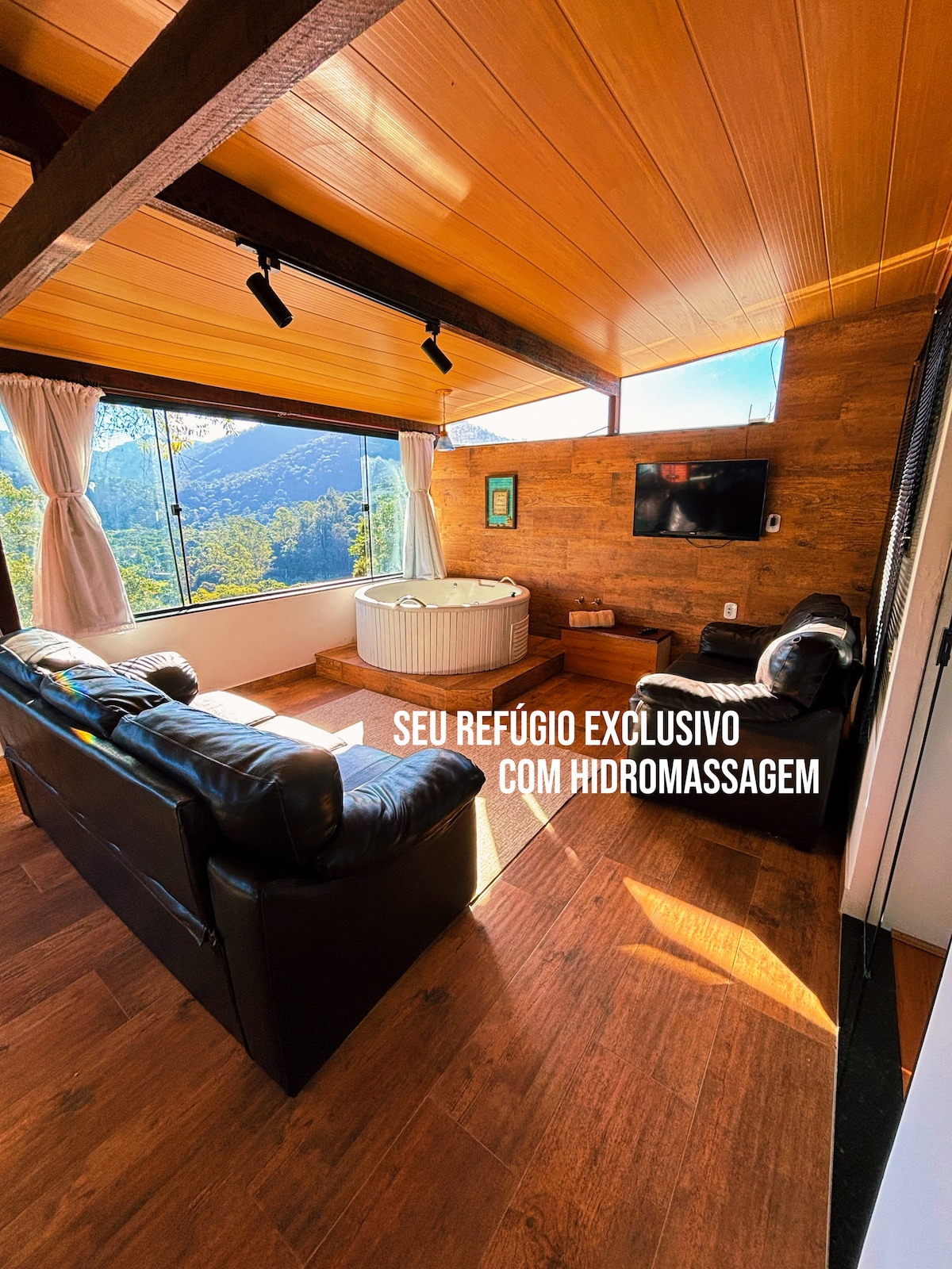 We are Espaço Verde Novo and this is the Ion Chalet! Large bathroom overlooking the forest, outdoor deck, jacuzzi, open shower, equipped kitchen, king size bed and fireplace. Fully private chalet. Balcony with hammock to enjoy the view of the waterfall and forest. A perfect charm for a pleasant stay in the Teresópolis mountains. Near Praça do Alto. We are Espaço Verde Novo, follow our Instagram and feel the peace of the green!