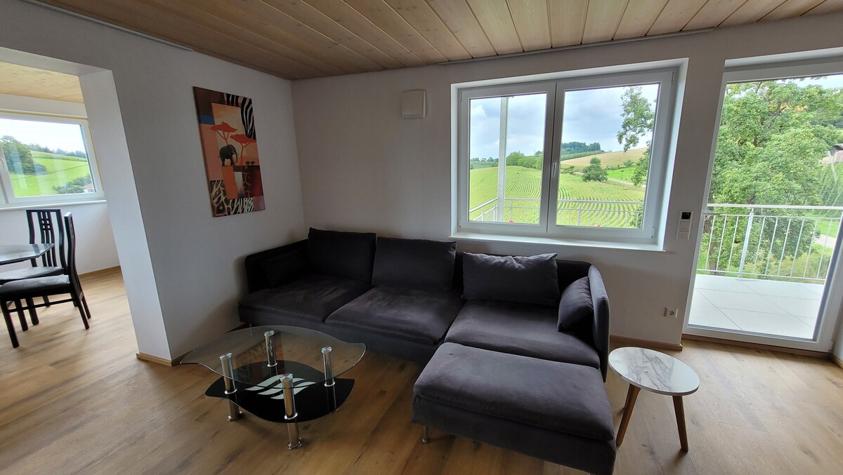 This brand new sun oasis of tranquility has been furnished with love and high-quality furnishings. In addition, the sun terrace offers a unique view of Lake Constance (approx. 6 km as the crow flies to Lake Constance). This invites you to enjoy a cozy meal and relax. Here you can watch unique sun games. In the living area there is a comfortable couch to relax on. A large TV and sound system is provided for your vacation entertainment.