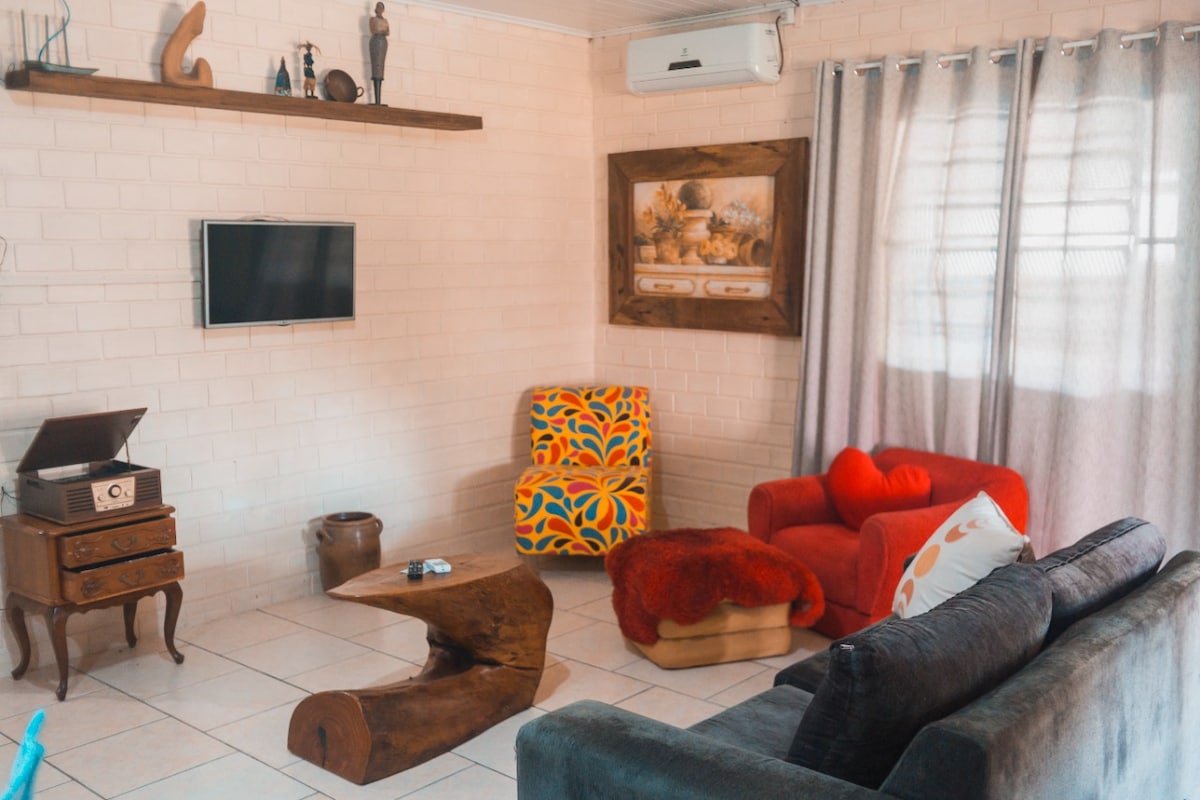Casa completa com garagem, ar condicionado nos 2 quartos, churrasqueira elétrica e pátio. Ideal para sua estadia a passeio ou trabalho. Wi-Fi de 30 Mb. ACEITAMOS PET PEQUENO, DESDE QUE PREVIAMENTE COMBINADO, E MEDIANTE TAXA EXTRA.