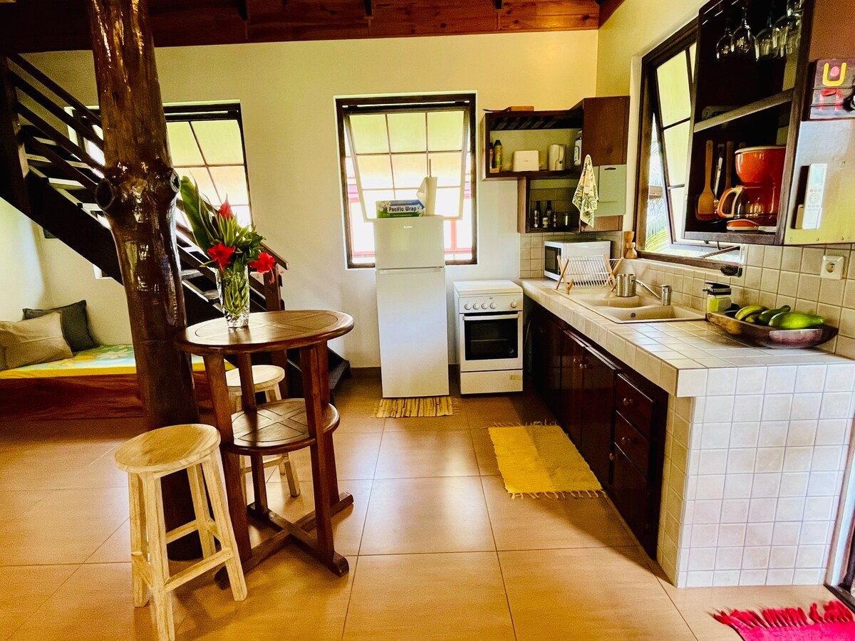 Bungalow duplex dans propriété privée, Aéroport international et inter-îles à 10minutes en voiture. Terrasse privative avec ponton à fleur du lagon où la baignade s'offre à vous. 2 kayacs pour ballades et accès au banc de sable , à 100 mètres du fare Vaima. Au rez-de-chaussée, espace cuisine équipée +salle à manger + une salle de bain. A l'étage, une grande chambre climatisée+terrasse avec vue imprenable sur Moorea et ses somptueux coucher de soleil. Supermarché ouvert 24h/24 à 10 mn à pieds.