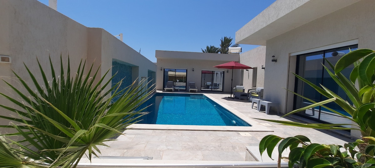 superb bright villa with A major asset on the island: an exterior with swimming pool not overlooked The entire neighborhood on one level to ensure discretion and absolute calm 5 minutes from midoun city center 4.3 km from Bourgo mall 700 meters from the lotus farm 5 km from crocodile park 8 km from the Djerba Casino 5 km from the most beautiful beach of Jerba Séguia and Yeti 20 minutes from Jerba airport 50 minutes from Zarzis, the 2nd most beautiful city in the south
