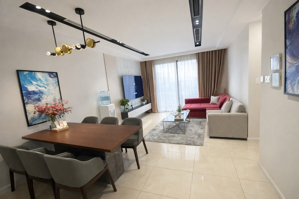 This is a spacious studio apartment located on the 22nd floor of block C2, D’Capitale Complex. With an area of 35m2, the apartment with wooden floors creates a cozy but still airy feeling with a large balcony. Beside the queen bed, the apartment has 1 bookshelf, a large sofa, and a dining table for 2 people. The kitchen is fully equipped with kitchen utensils, suitable even if you have a long stay. The apartment also has a smart SAMSUNG TV with Netflix and fast internet for remote working.