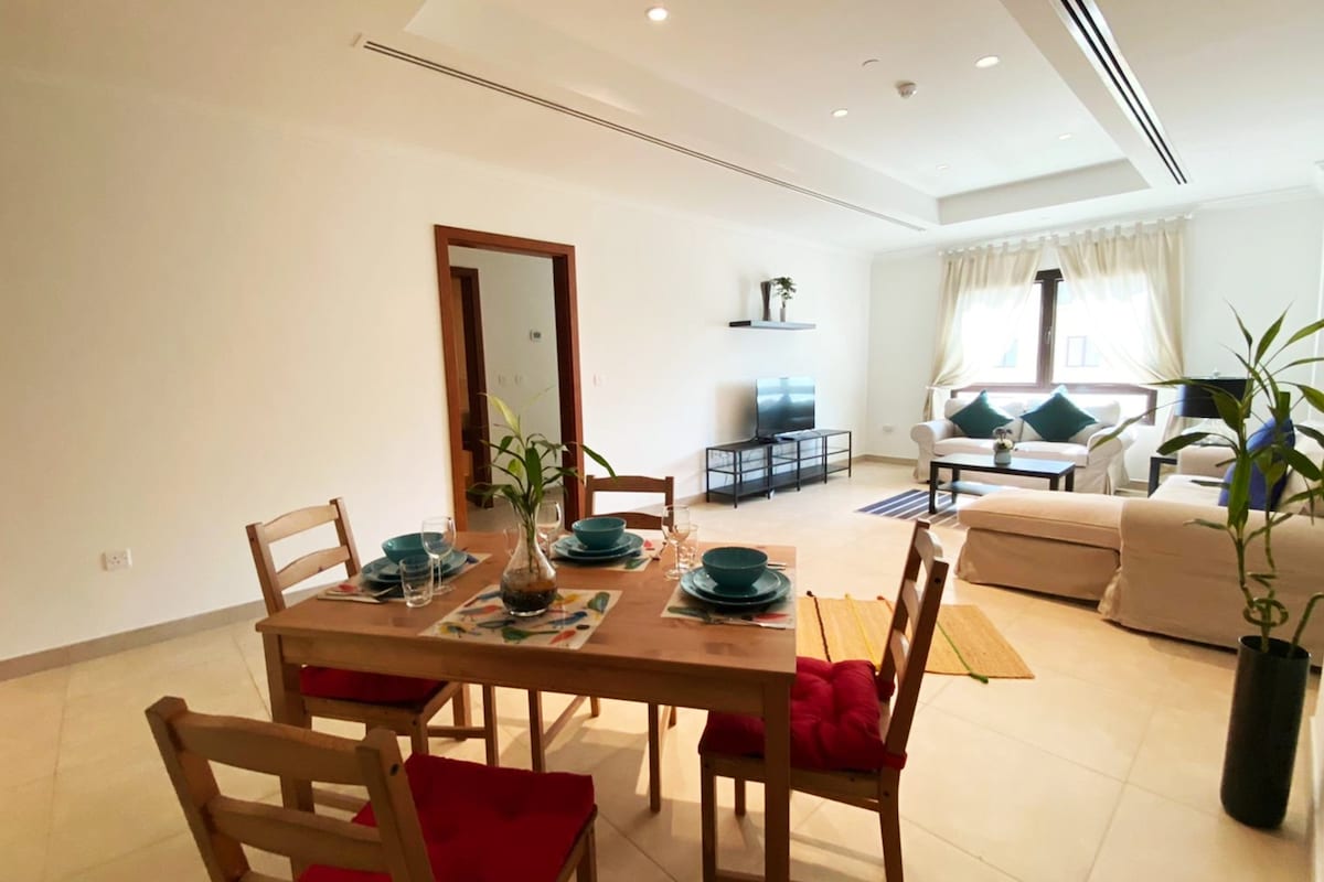 You can enjoy your stay at this stylish 130 sq meter apartment located at the most attractive area called Pearl Island of Qatar. You will enjoy walking on the marina which is surrounded with many restaurants, cafes and shops. The area has metro station that connecting to the most of the World Cup Stadiums. There is a free car parking, the tower has 24 hours security, helpful reception and maintenance services. Cleaning services are free for 1 week + stays.