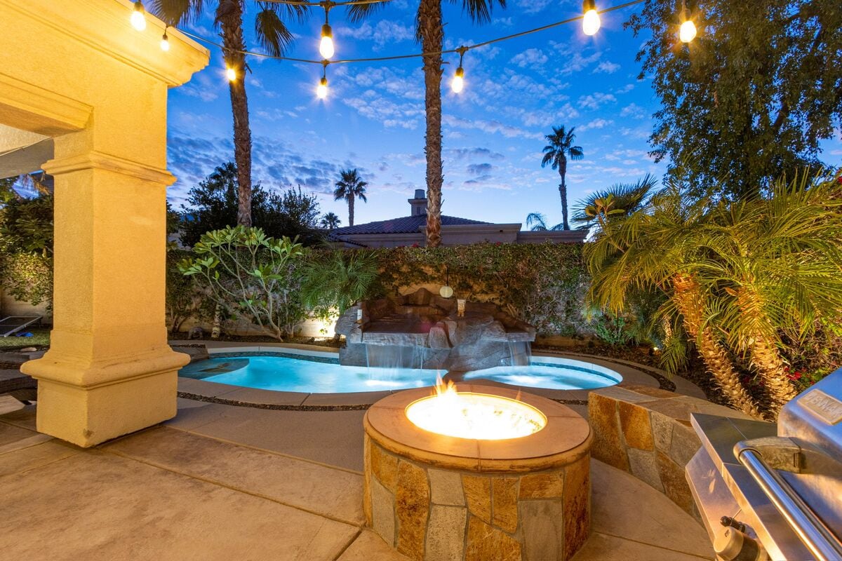 Escape to your private desert oasis—where sunshine, palm trees, and peaceful golf-course views create the perfect Indio getaway. 💦 Saltwater pool & free spa heating 🎮 Game room: pool table, ping pong, arcade & smart TV 🛏️ Sleeps 10: 2 Kings, 1 Queen, Queen+Full bunk 🍳 Chef’s kitchen + coffee bar 🔥 Fire pit, BBQ, outdoor dining & lounge 🎾 Tennis, pickleball & gym (4 guests) 🚗 Near Indian Wells, La Quinta & Joshua Tree