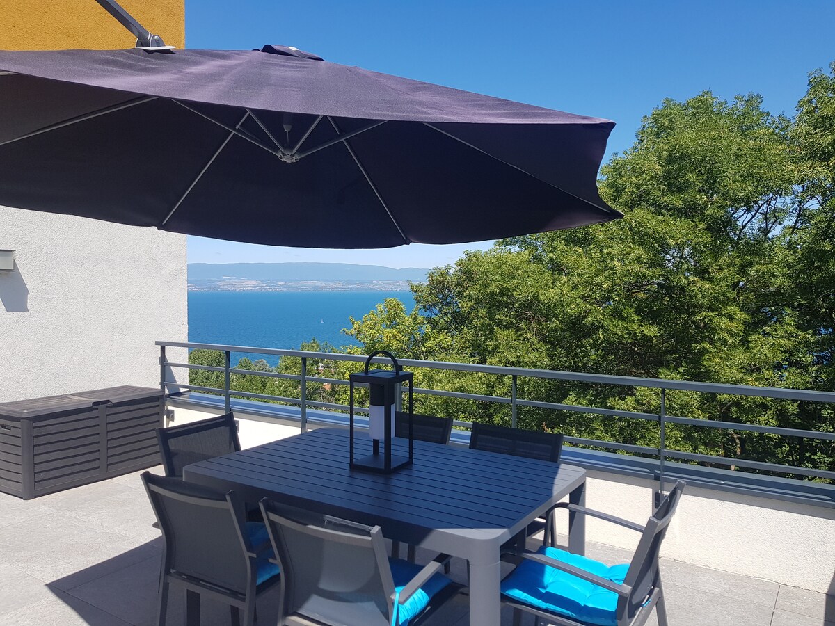 Beautiful flat of 110m2 with two bedrooms, a private garden, terrace and spacious veranda. It also has a large living room and a beautiful dining room/kitchen. The place is tastefully decorated. The view is panoramic on the lake and the mountains. The entrance to the A9 motorway is 3 minutes away. Many walks in the Lavaux vineyards are possible directly from the house. 5 minutes away from the beach of Rivaz (Lake Geneva) and 30 minutes from the mountains!