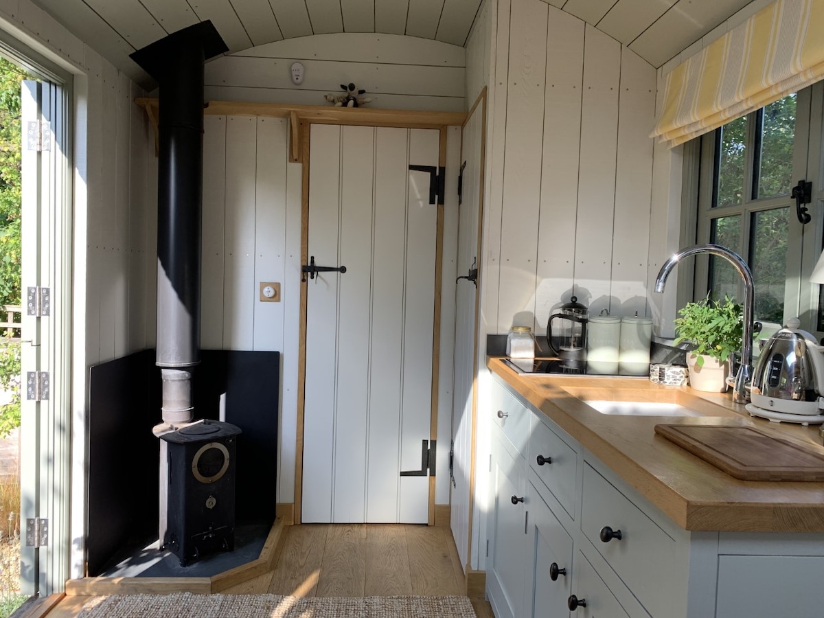 Delightful shepherds hut set back within a private garden in a beautiful village near Hungerford, in Wiltshire. A rural idyll, easily accessible from London. Endless countryside walks from the village, close proximity to the Swan pub which serves excellent local ale and good food, 15 minutes from the historic market town of Marlborough and within reach of many other places of interest including Avebury and Stonehenge. An equally beautiful and relaxing retreat in summer or winter.