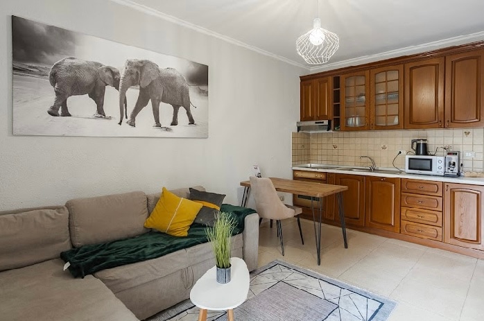 Modern and cozy studio, perfect for a couple or a couple with one child. Features a spacious bed, sofa, fully equipped kitchenette, and a 65’’ Smart TV with Netflix. Stylish design, comfortable atmosphere, and central location – ideal for your stay! This unique place has a style all its own.