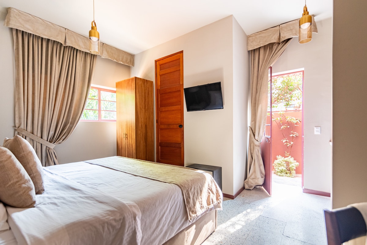 We are in the heart of Tlaquepaque, a magical town on Juárez Street, which is already semi-pedestrian. It's important to mention that there is no parking outside the apartment, we have an agreement with a parking lot 1.5 blocks away. You'll be in the best location in the downtown area. We have a master bedroom with its own bathroom and king-size bed. Another bedroom with 2 single beds that can be put together to make it a double, and a third bedroom on the rooftop with a bed. It is a very simple room.