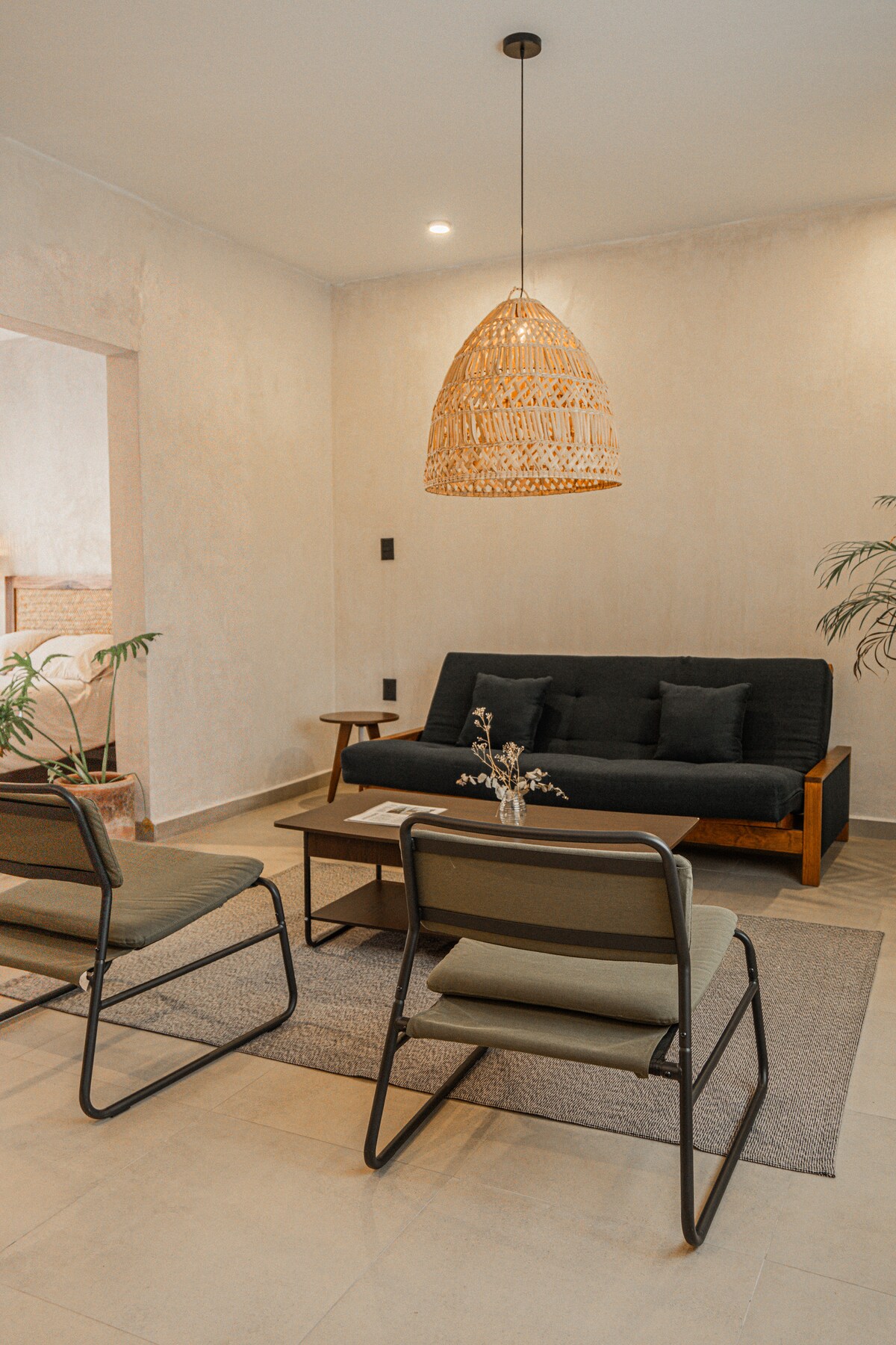 Hospédate en un departamento estiloso y funcional recién construido que ofrece diseño contemporáneo, confort y ubicación privilegiada. A solo minutos del Cerro del Borrego Ecoparque y del Parque Alameda, este espacio en planta baja con patio compartido es perfecto para disfrutar de Orizaba entre naturaleza y cultura. A pocos metros tienes acceso a una parada de autobuses, entre ellos el “Gallo”, que recorre la ciudad gratis y conecta con sus principales atractivos turísticos.