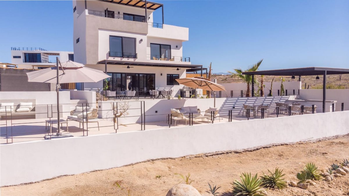 Intentionally designed luxury retreat, featured on Emmy-winning Staycation, with sweeping ocean, mountain and desert views. Tres Villa offers 3 standalone bedroom casitas and a shared central living space, ideal for couples or families who want togetherness & privacy (sleeps 6). Enjoy a heated saltwater pool, hot tub, hotel-style loungers, rooftop living with BBQ, built-in dining, lounge seating, fire pit and sunrise-to-sunset views. Desert setting ~5 min to restaurants, ~10 min to town & beach.