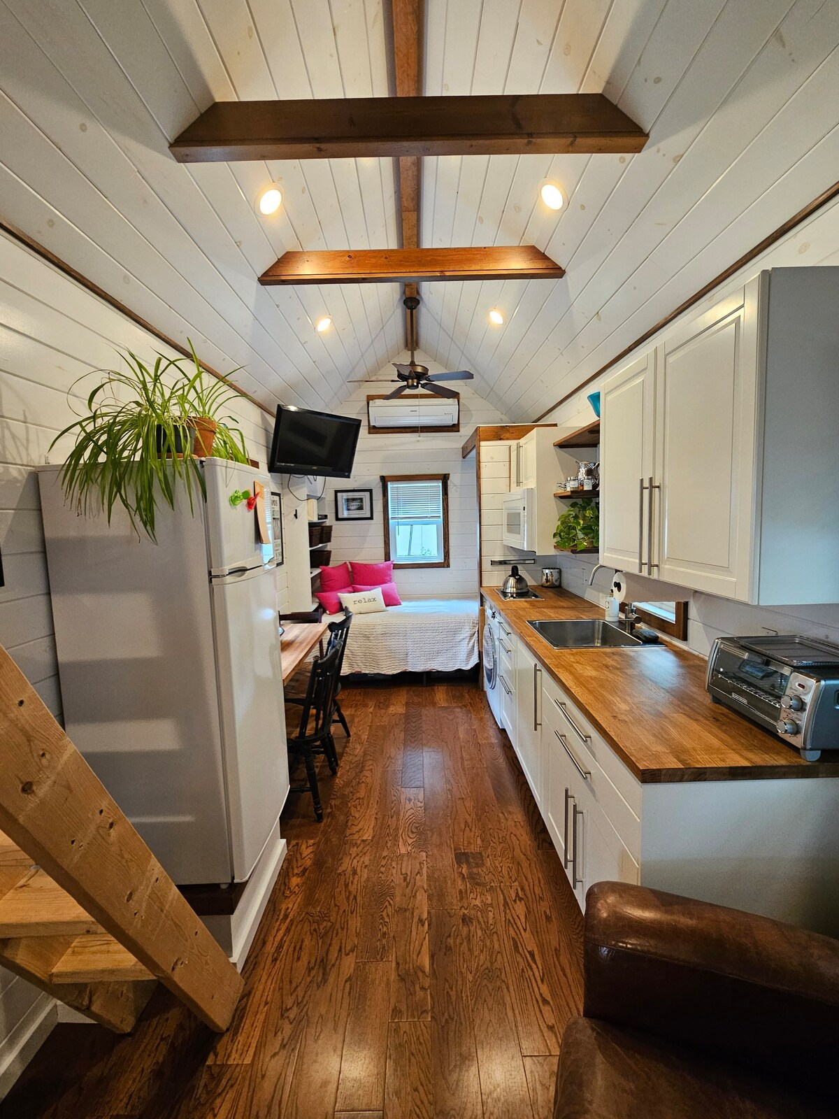 Eco-Friendly Tiny House with AC in Stonington that sleeps three. Close to downtown Mystic, Westerly and local beaches. Twin size bed on main floor that transitions to a couch, loft has two twin beds that convert into a king-sized setup. Fully equipped kitchen and a full bath with a composting toilet. Private outdoor space with a gas fire table, gas grill, charcoal grill and a hammock for relaxing. 9 miles to downtown Mystic, 7 miles to Misquamicut Beach and two casinos within a 30 min drive.