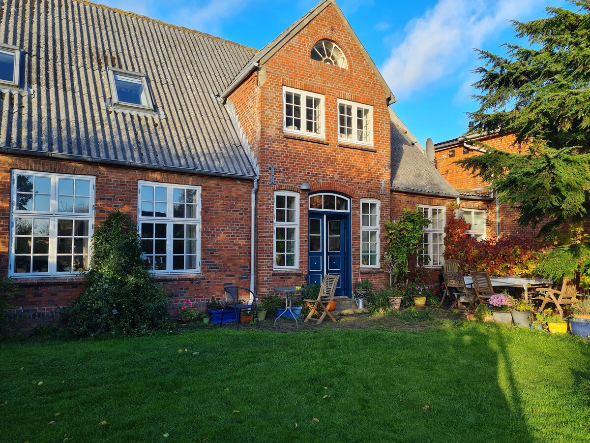 Live with a view of the Wadden Sea in your vacation apartment on the top floor of Gamle Skole Nørhus, Ballum. The bright and cozy rooms invite you to relax and feel at home. The apartment has two bedrooms, a walk-in closet, a kitchen, a bathroom with shower and toilet and a separate toilet. The guest area in the garden invites you to relax with comfortable lounge furniture. The cozy picnic table with sea view at the large barbecue area with grill is ideal for barbecues.