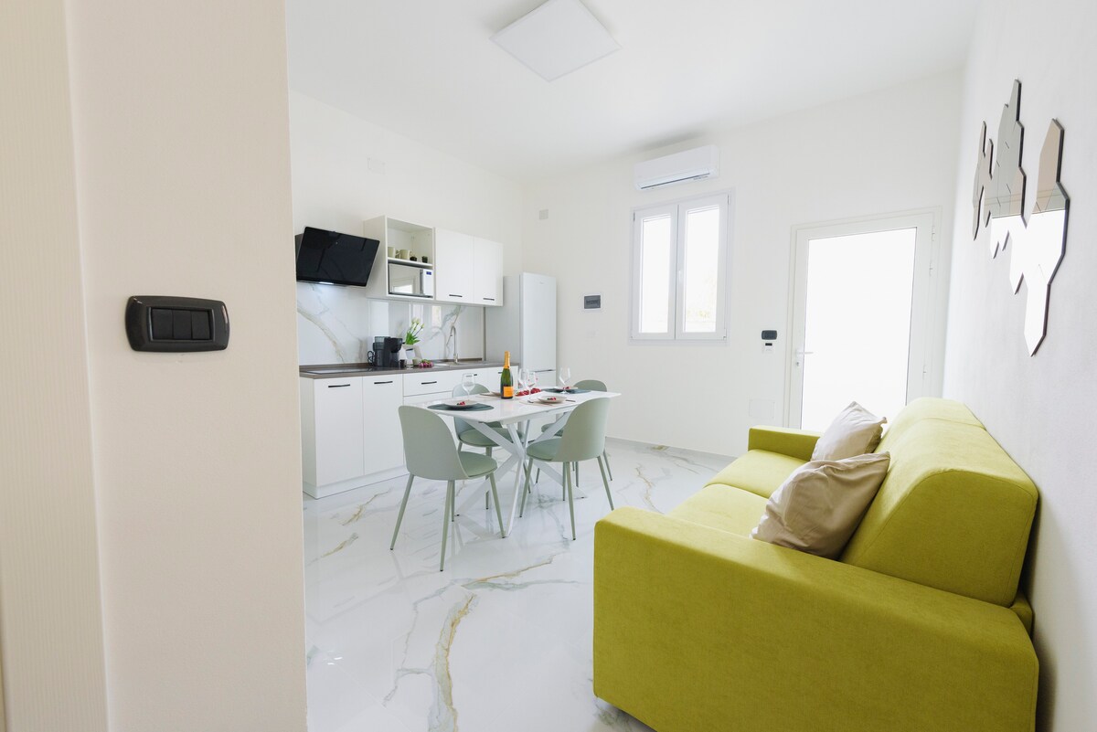 A unique experience of relax in a Sea View finely furnished apartment. The building is located directly in Torre Ovo’s bay, in the province of Taranto. The apartment has: custom designed furniture; one bedroom with queen size bed and a very comfortable sofa bed in the living room; direct access to the private beach with 2 sunbeds and one beach umbrella included in the price of the apartment; private garden; and offers various extra services as: private chef; boat excursions, Beauty Treatments.