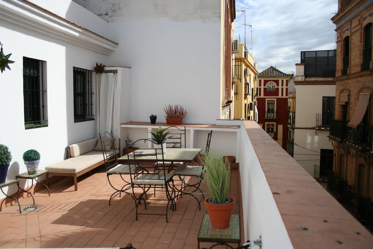 Cheerful, southern, and intoxicating, this apartment stands out for its meticulous decoration down to the last detail and the splendid terrace, from which you can admire the emblematic Church of the Savior and the tower of the old Mosque. Â The contrast and harmony between contemporary interventions and preserved elements provide magical journeys through time. Experience the city's legacy from within with all modern amenities. The entrance in the kitchen, new and modern, then opens to the large living room with two large French windows to the outside, and then to the bedroom with bathroom inside, with shower. The building has two floors (with an apartment on each one), plus the communal terrace with wonderful views of the Salvador church. The building and the apartment have been recently restored respecting the original elements. The apartment has been designed and equipped so that you can live in it as if it were your home in Seville: *High speed WiFi * Air conditioning hot / cold * Hair dryer *Flat Screen TV * Full kitchen (kitchenware, microwave, ceramic hob, refrigerator, freezer) * Nespresso machine *A toaster * Electric kettle * Orange Juicer * Clothesline, iron and ironing board. *Hangers in the closets. * Shampoo and Shower gel. You will find a corner dedicated to bookcrossing. Here you can take the book that interests you the most and leave one that you have read and that you want to share with other travelers. Laundry room + shared terrace with the apartment below, equivalent in size to this one. Upon arrival, we will offer our guests a tour of the property, and we will provide information about the area, walks, restaurants or any other site of interest that you may need. We will be happy to help you with everything you need, before and during your stay, according to your interests, and to share with you all of our best suggestions! The apartment is located in a unique enclave, within the monumental and commercial area of historic downtown Seville. Literally next to the Church of El Salvador and a few minutes from the Santa Cruz neighborhood, it allows you to forget about the car. With the Cathedral on one side and the Plaza EncarnaciĂłn Market (Metropol Parasol) on the other, it is an area characterized by masterfully connecting the old and the contemporary, offering one of the most charismatic corners of the city. Excellent location without having to travel or use public or private transportation. You will always be close to everything. From the apartment you can walk to anywhere in the historic or commercial center in a few minutes, or even rent bicycles. In the heart of Seville's social and cultural offering! Wonderful apartment located in the heart of historic downtown Seville, in a charming and attractive building. In a unique enclave, on a street perpendicular to the beautiful Plaza del Salvador, a few steps from the Cathedral and places of great historical and artistic interest. The apartment is located on the second floor and has a 40m2 terrace shared with neighbors. The apartment has been designed and equipped so that you can live in it as if it were your home in Seville. We personally welcome guests. The house will be at your disposal and everything ready for your stay, the beds made and a set of towels provided for each guest.