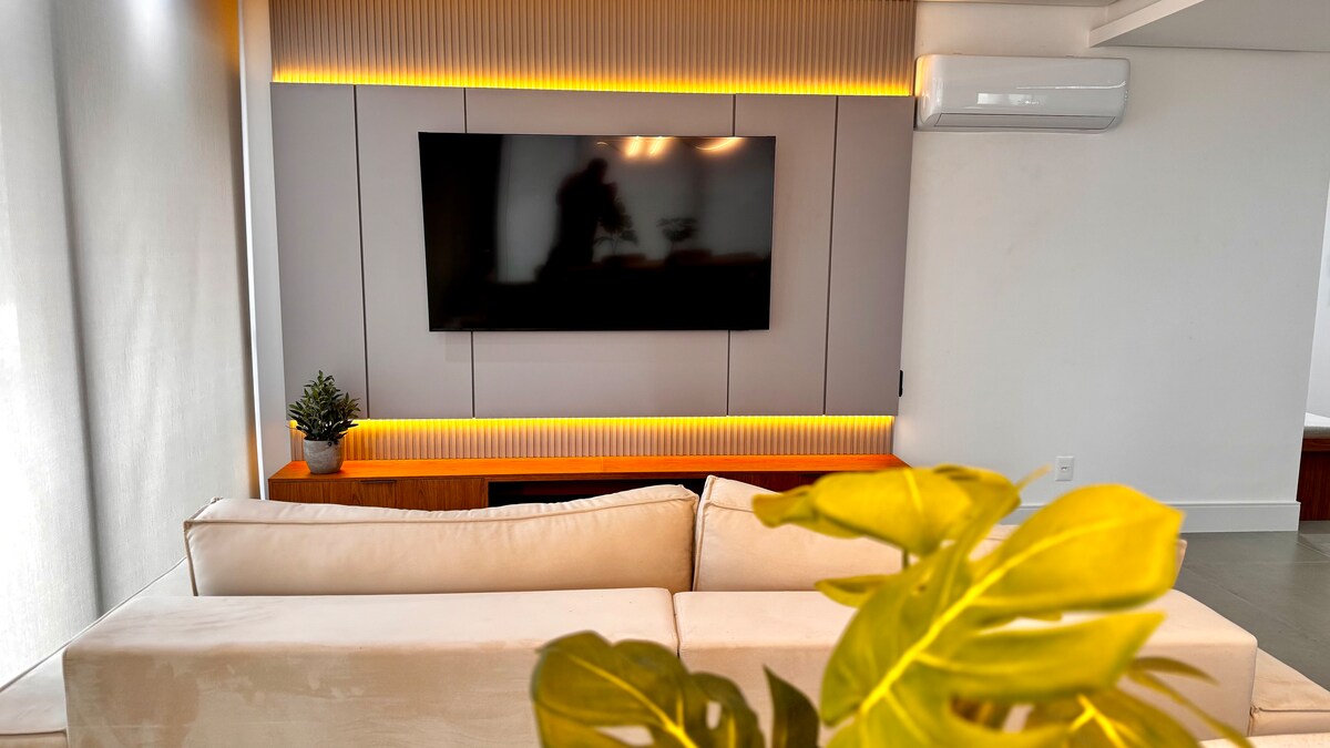 Beautiful flat with custom-made furniture. It has hot and cold air conditioning, TV in the living room with Sky HD with football, movies, etc. (almost complete package) and also TV in the bedroom, microwave, Airfryer, barbecue. Tenth floor. Building with laundry (paid), gym, ballroom and rooftop pool (closed from 9/15 to 11/10). In the best location, where everything happens, next to Praça XV and 300m from Prainha. Everyone is welcome.